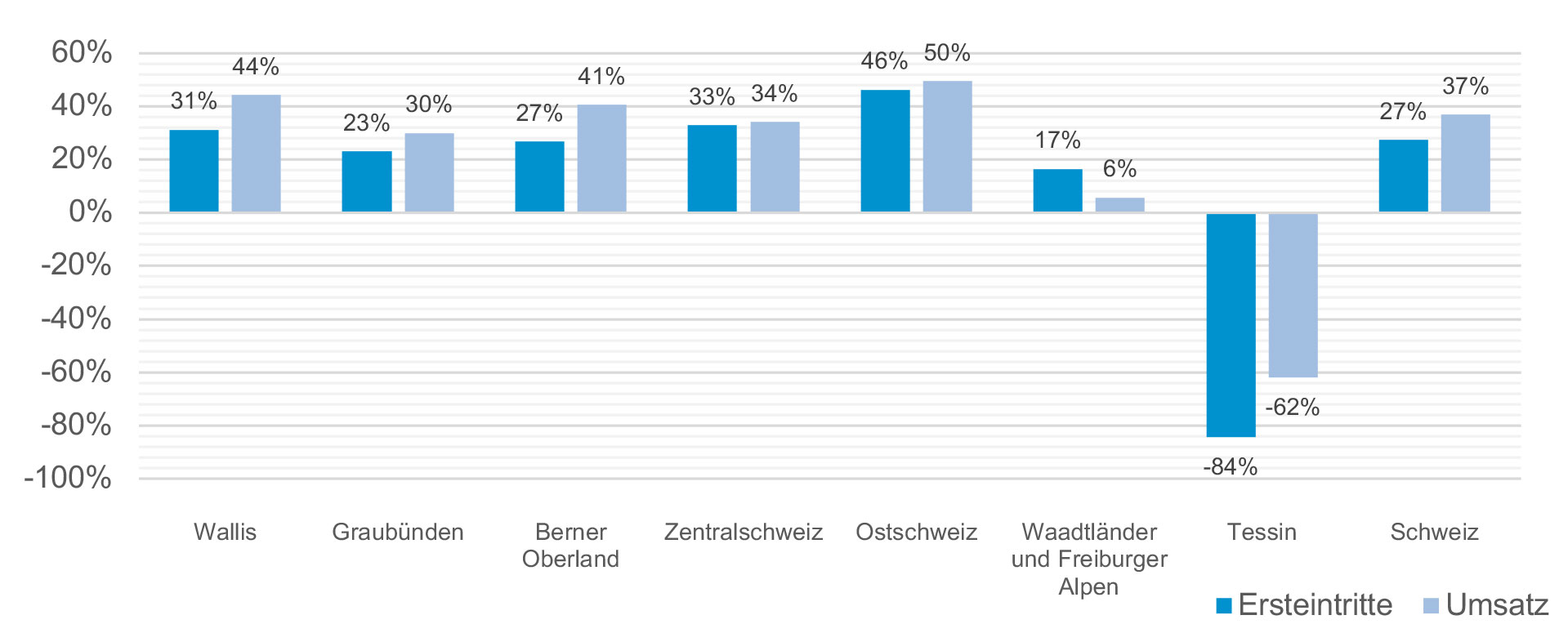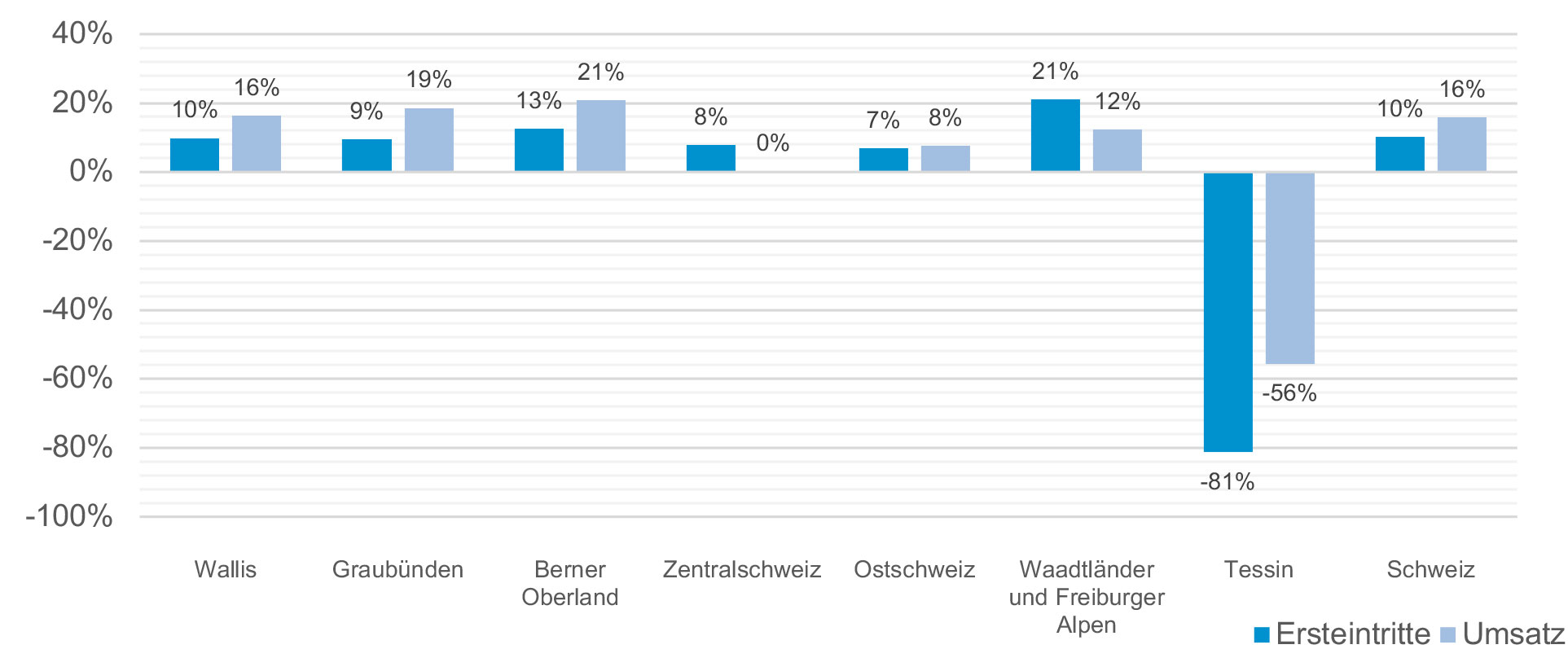 Seilbahnen Schweiz hob die Kapazitätsbeschränkung bei Großgondeln auf. Gesamtschweizerisch konnte eine Steigerung der Ersteintritte von 27 Prozent und des Umsatzes von 37 Prozent verzeichnet werden (vgl. Abb.1).