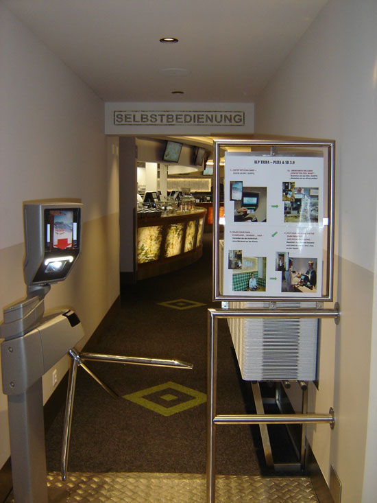 Bereits beim Eintreten ins Restaurant Alp Trida in Samnaun bemerkt man kleine Besonderheiten, welche man so aus anderen Skihütten mit Selbstbedienung nicht kennt. Der Eintritt erfolgt etwa, wie bei den Liftanlagen, durch ein Drehkreuz. Zutritt erhält man dabei nur mit gültiger Skikarte. Falls diese nicht erkannt