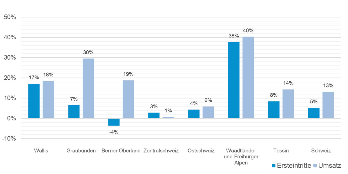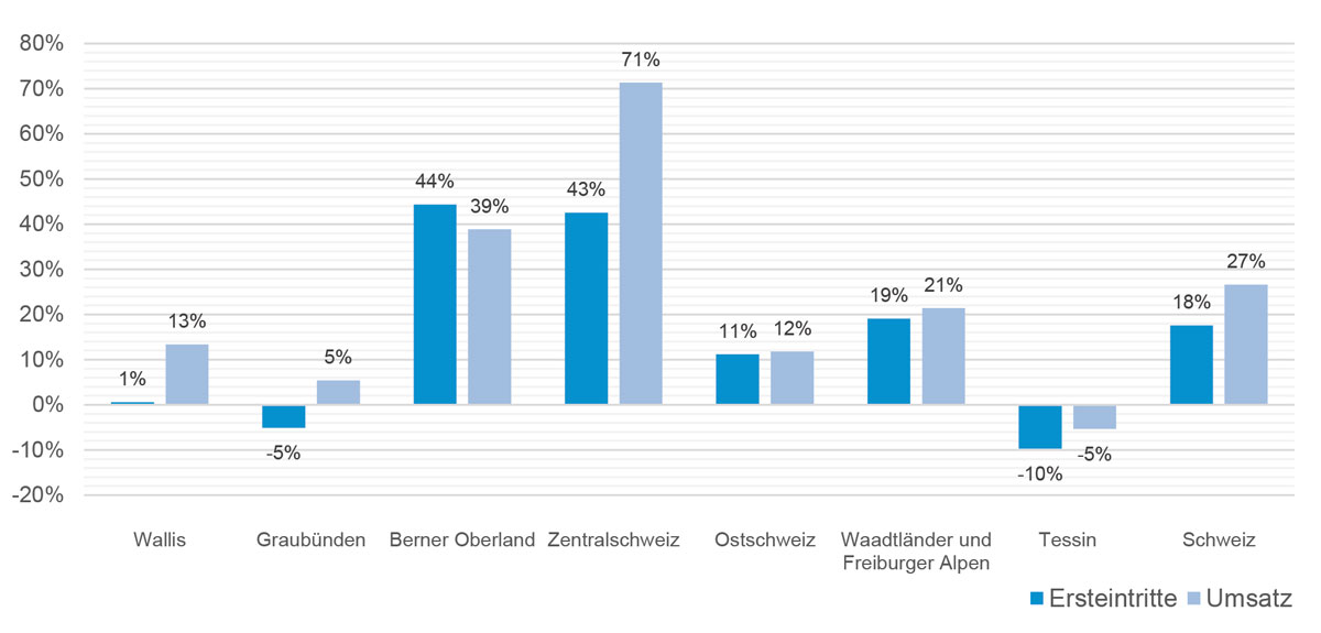 Für die Schweizer Seilbahnbranche war 2022 ein leicht überdurchschnittlicher Sommer, wenn man ihn mit dem Fünfjahresdurchschnitt vergleicht: +5% bei den Ersteintritten und +13% beim Umsatz (vgl. Abb. 2). Hier stechen die Waadtländer und Freiburger Alpen mit einem Plus von rund 40% deutlich hervor.