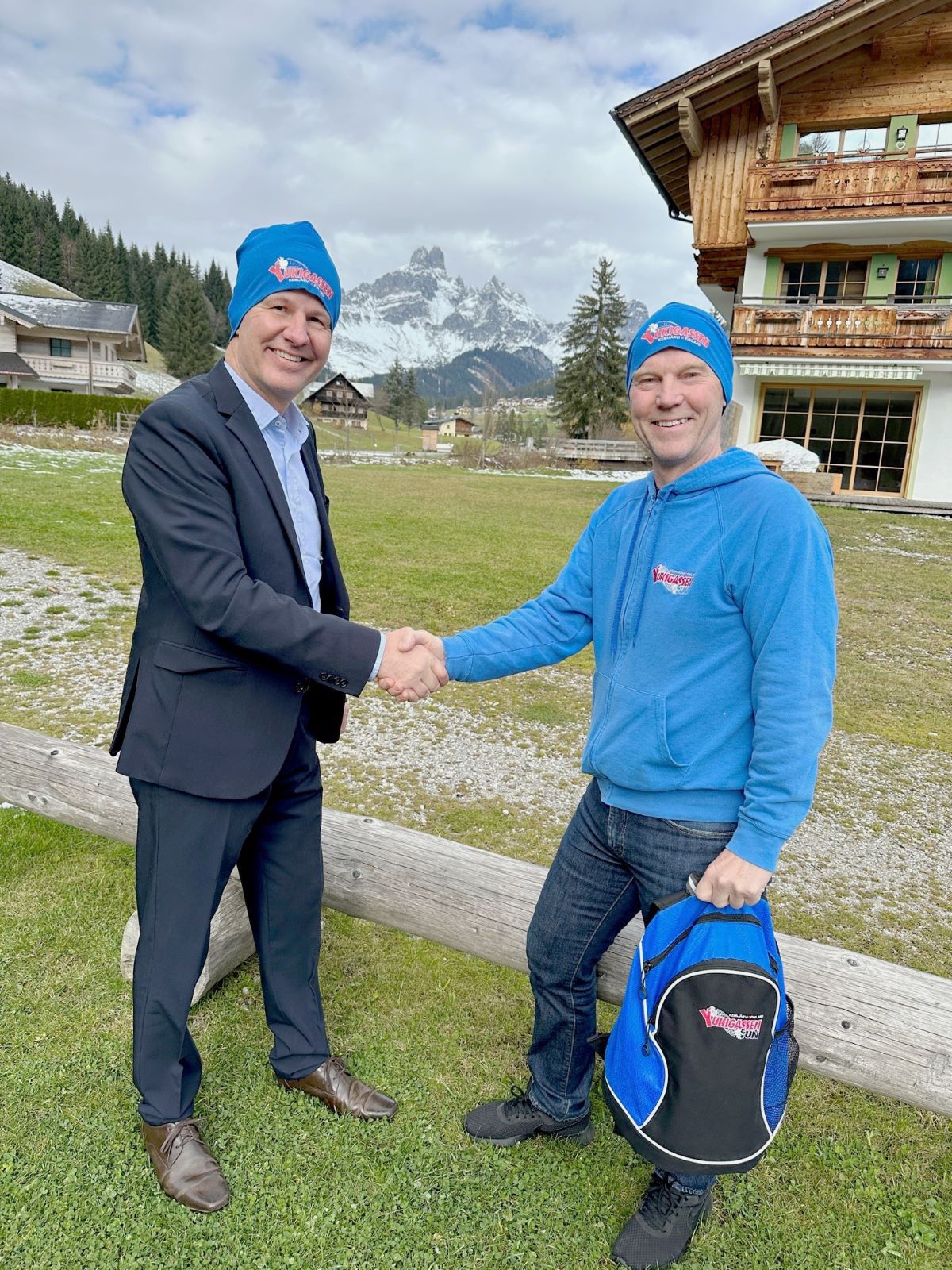 Filzmoos Tourismuschef Peter Donabauer (links) und der Präsident des finnischen Yukigassen-Verbandes und Mitglied des Weltverbandes Ari Pöyliö.
