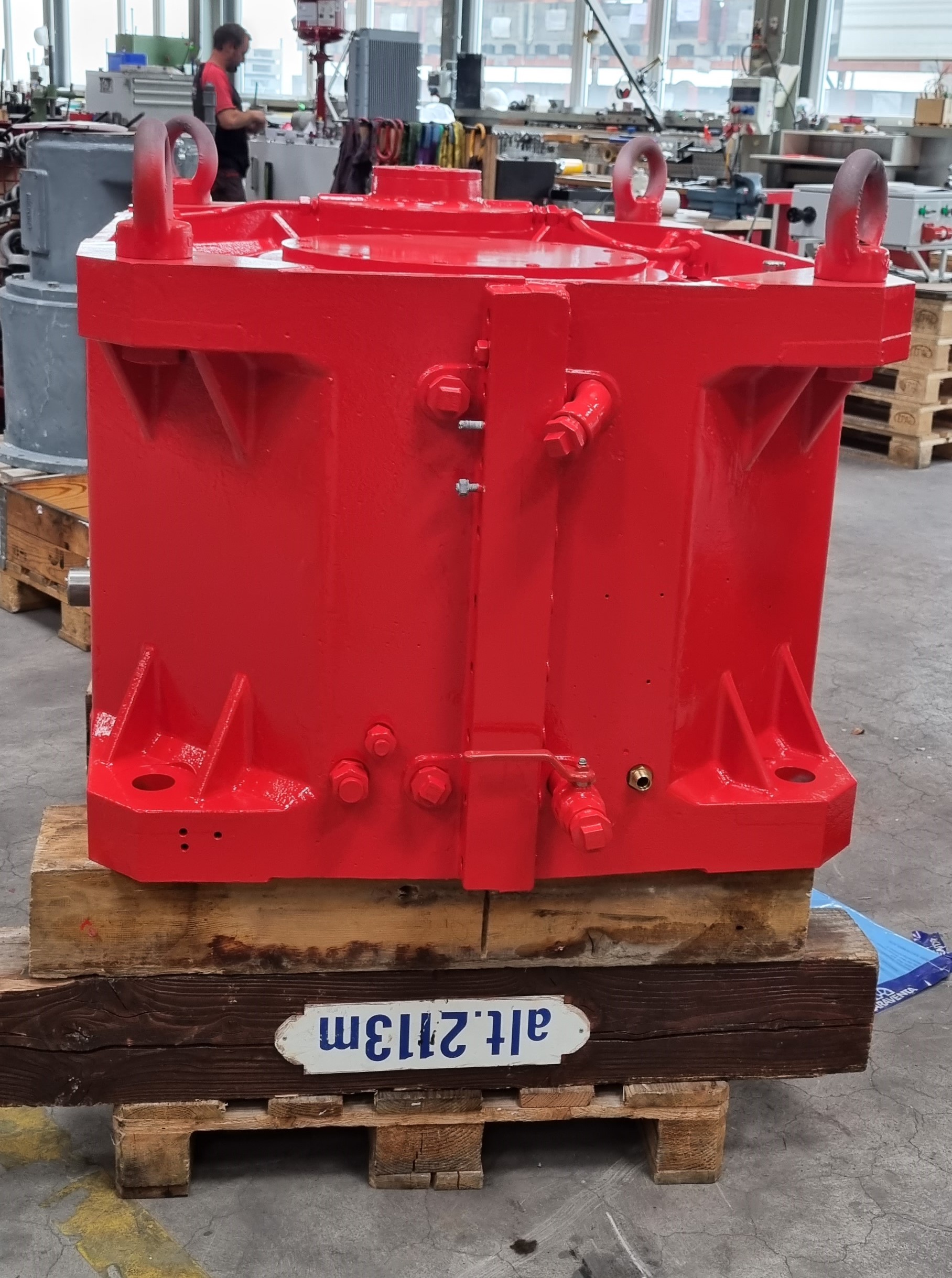 Ein Getriebe – frisch lackiert und bereit, wieder an seinen Einsatzort zurückzukehren.