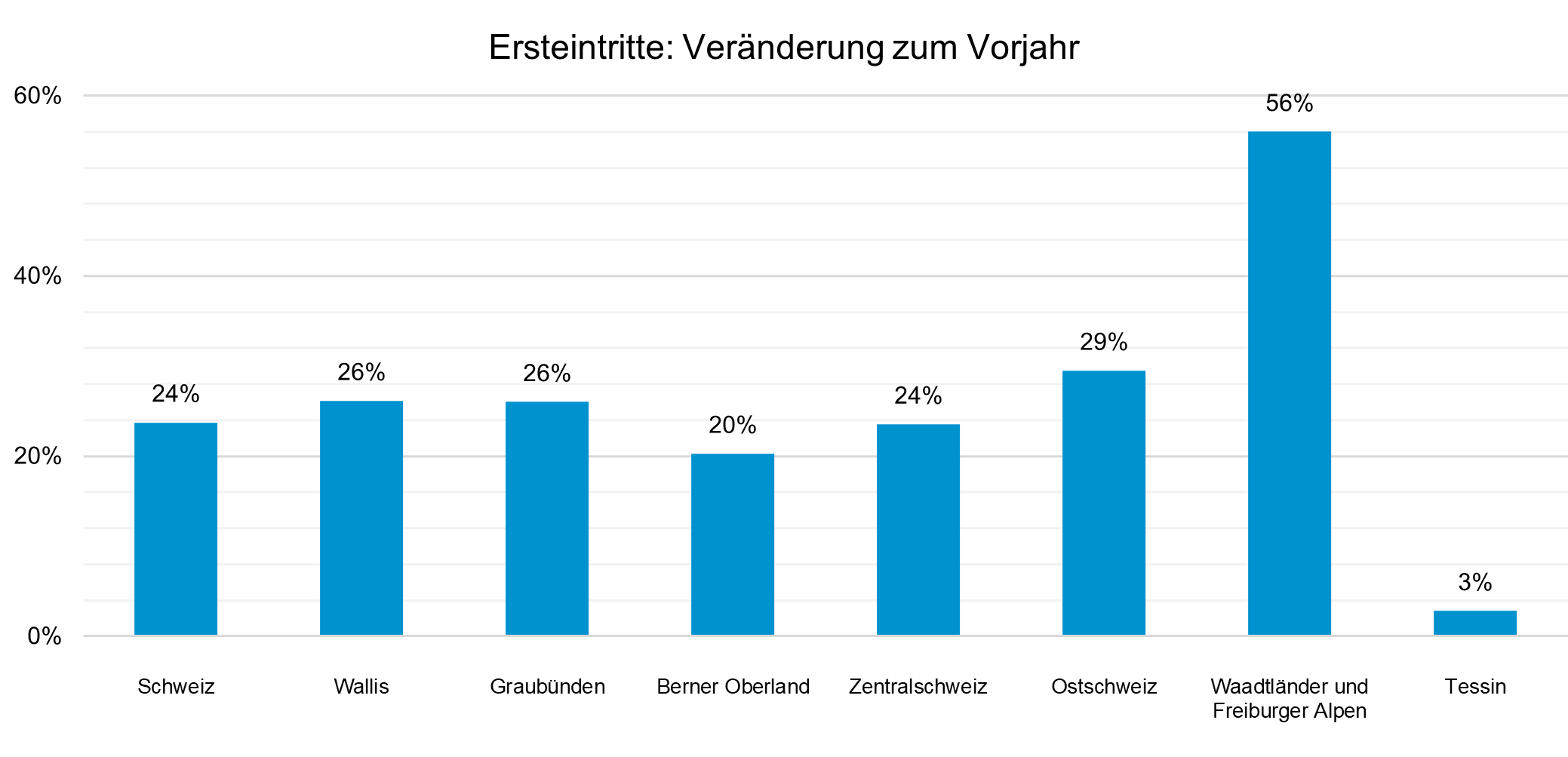 Der Saisonstart verlief auch regional in den meisten Regionen positiv: Die Bergbahnen der Waadtländer und Freiburger Alpen verzeichneten das stärkste Wachstum mit über 50 Prozent.