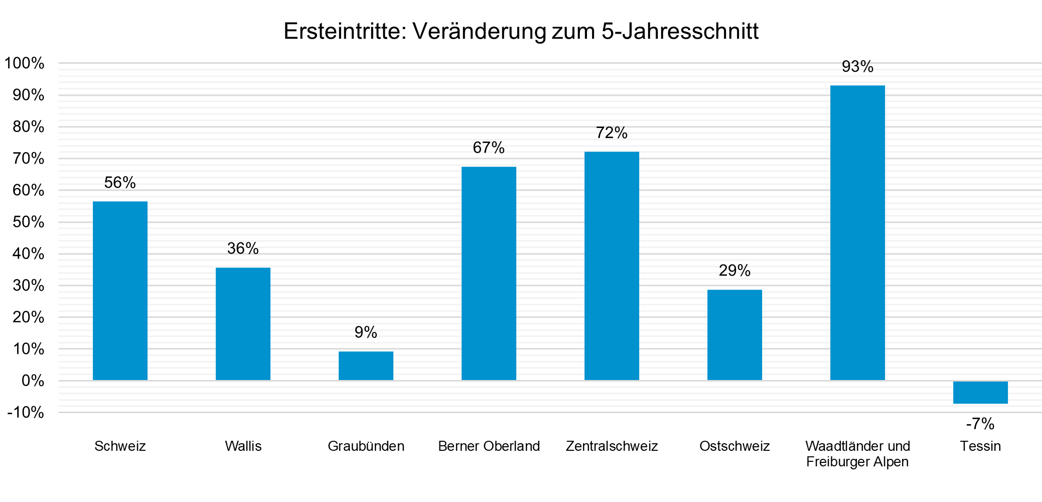 Auch beim Vergleich der Regionen mit dem Fünfjahresschnitt stechen die Waadtländer und Freiburger Alpen hervor mit einem Zuwachs von 93 Prozent. Auch die Zentralschweiz (72 Prozent) und das Berner Oberland (67 Prozent) verzeichnen sehr große Zuwächse.