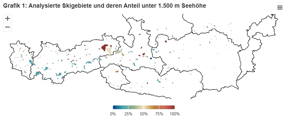 Für die Analyse werden Daten aus OpenStreetMaps verwendet. Rund 3.600 km² gelten dort als Skigebiet, davon liegen 1.400 km² (39 %) unter 1.500 Metern.