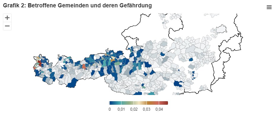 Freie Kartenflächen zeigen Gemeinden ohne Skigebiet im 10-km-Umkreis. Die Farbskala gibt den Anteil gefährdeter Kredite von niedrig (grau) bis hoch (rot) an.