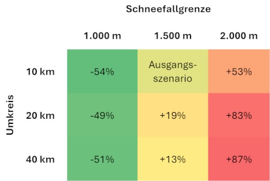 Um die Sensitivität der Ergebnisse abzuschätzen, haben die Experten die angenommene Schneefallgrenze und den Umkreis der Gemeinden geändert. Wie stark sich die Schneefallgrenze in der Realität verschieben wird, hängt vom Ausmaß der Klimaschutzmaßnahmen ab.