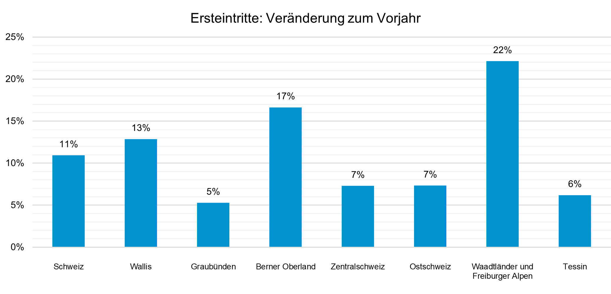 Ein Blick in die jeweiligen Gebiete zeigt regionale Unterschiede und Besonderheiten auf. Den größten Zuwachs können wiederum die Waadtländer und Freiburger Alpen vermelden (+22 %), das Berner Oberland folgt mit 17 % an zweiter Stelle, gefolgt vom Wallis mit 13 %. Die weiteren Regionen haben alle einen positiven einstelligen Prozentwert (vgl. Abb. 1).