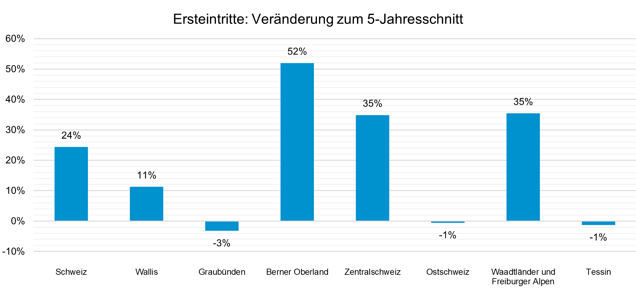 Vor allem Regionen mit hohem Anteil an internationalen Gästen schneiden überdurchschnittlich ab: Das Berner Oberland ist die Region mit dem größten Zuwachs (+52 %), gefolgt von der Zentralschweiz und den Waadtländer und Freiburger Alpen (je +35 %). Auch das Wallis zeigt mit 11 % eine positive Veränderung, während das Tessin, Graubünden und die Ostschweiz stagnieren (vgl. Abb. 2).