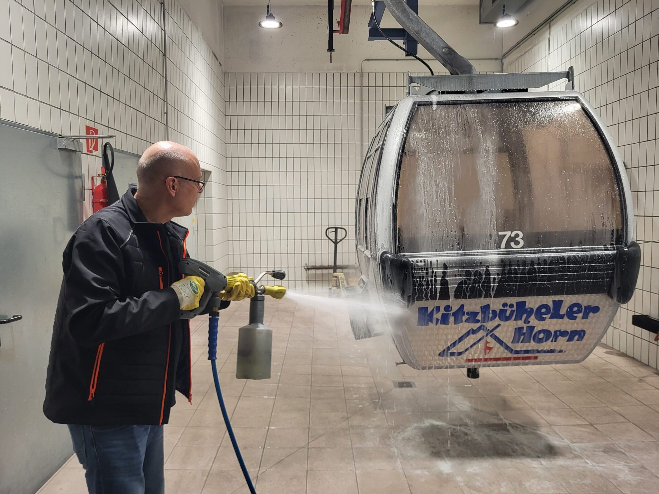 inspects the parts cleaning system of the 6-seater Brunelle chairlift in Kitzbühel. The IBS expert provides advice and conducts inspections for ski resorts on cleaning and safety.