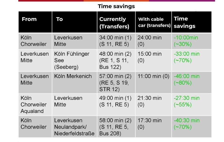 Travel time calculations show that the proposed cable car lines could reduce journey times by up to 25 minutes compared to the current public transport system. The cabins are planned to operate at 30-second intervals.