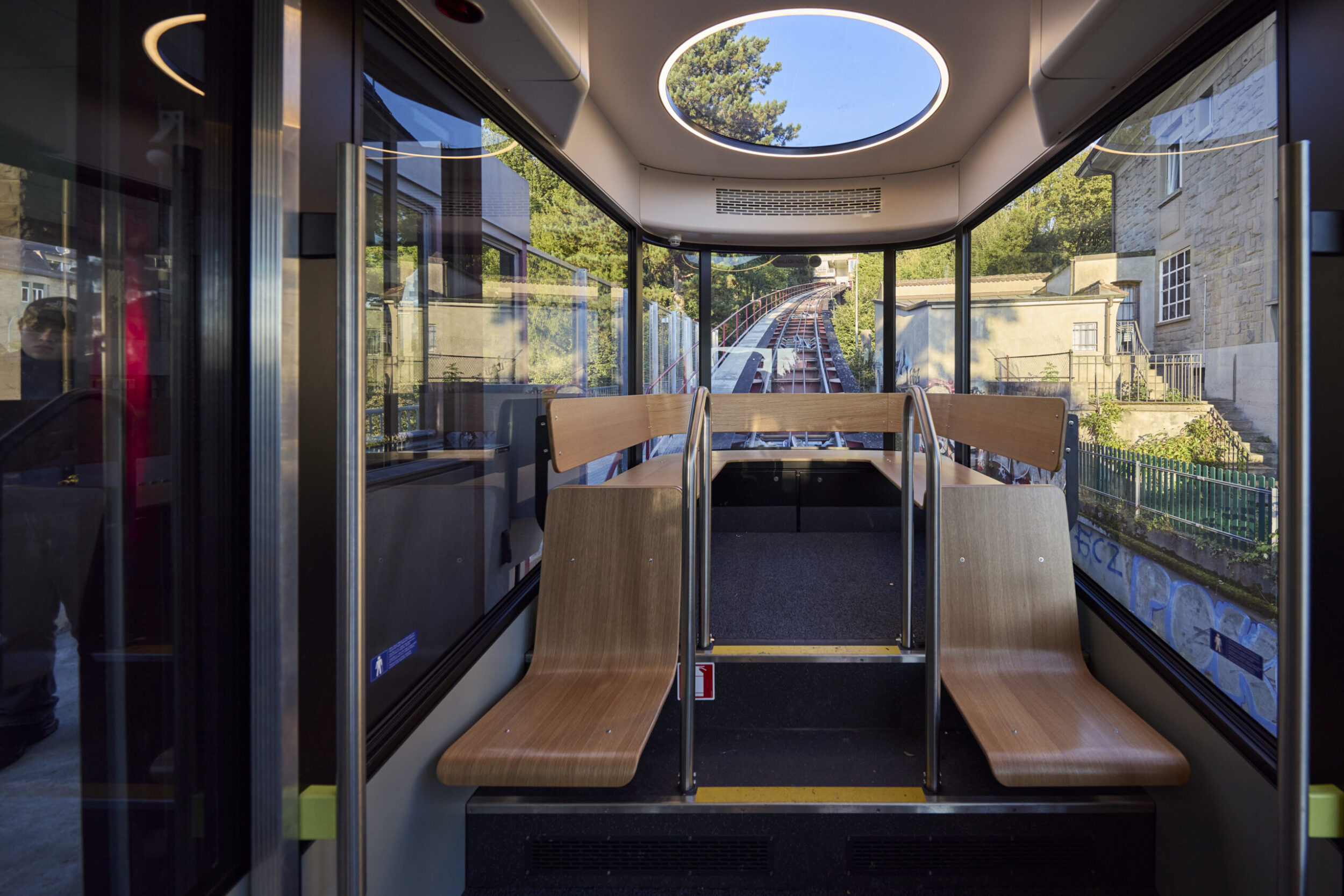 Both vehicles are unique. Special lighting rings on the interior ceiling create a distinctive atmosphere inside. On the uphill side, each lighting ring frames a round skylight, allowing additional daylight into the cabin.