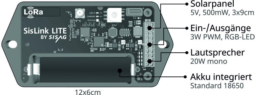 ist die kompakte Basisversion für einfache Anwendungen mit geringem Energiebedarf. Ideal zum Abspielen von Audiodateien, für Signal Ein- und Ausgänge und auch für einfache LED-Beleuchtungen. Für einfache Durchsagen beträgt die Autonomiezeit ohne Solarpanel rund ein Jahr.