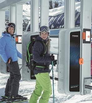 Das AX500 Smart Gate NG BLE löst nach Validierung die Öffnung des Zutritts aus und der Skifahrer kann, ohne das Handy aus der Jacke nehmen zu müssen, durch das Gate und zum Lift gehen.