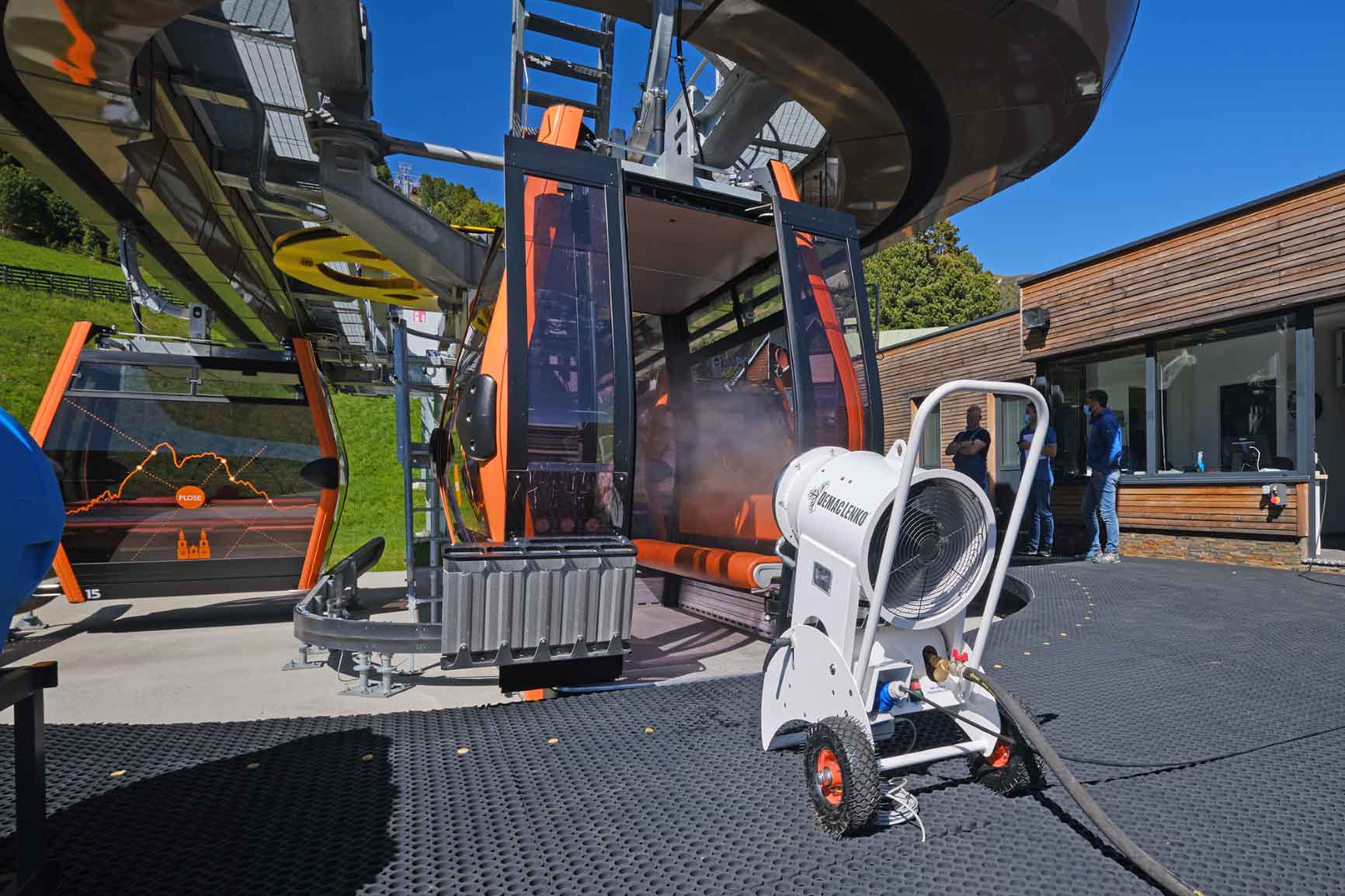 DEMACLENKO, bisher vorrangig im Beschneiungssektor tätig, hat deshalb ein vollautomatisches System entwickelt, mit dem Skigebiete die Desinfektion der Kabinen ohne personellen Mehraufwand bewerkstelligen können. In einigen Skigebieten, wie z.B. Stubai und Plose, war das System schon im Einsatz.
