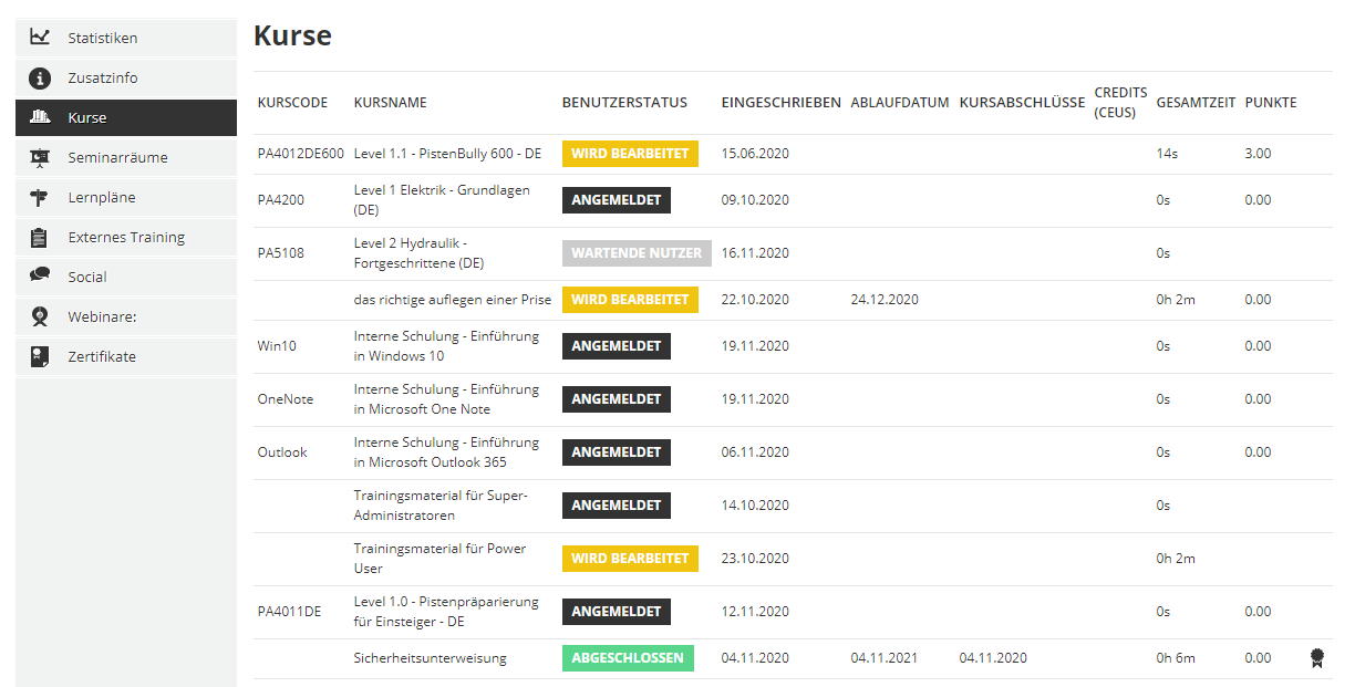 Im Bereich der Kurse kann ein Vorgesetzter genau nachvollziehen, welcher User welche Trainings abgeschlossen oder noch gar nicht begonnen hat. Er sieht sowohl die Zertifikate als auch die Bearbeitungszeit und die erreichte Punktzahl