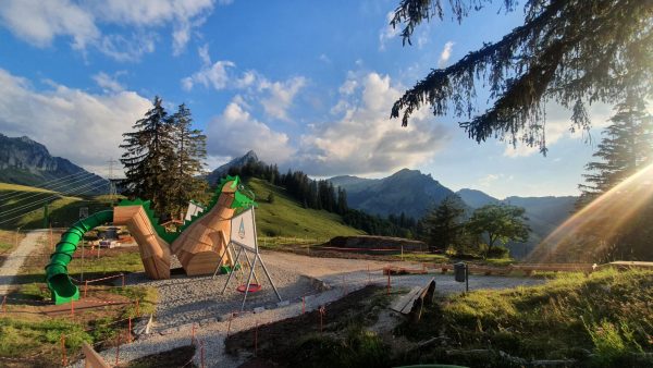 Während der Bergfahrt mit der Sesselbahn „Riggisalp“ kann man es schon entdecken – das Drachenland Kaisereggbahnen. Neben der Bergstation stehen der bespielbare Drache aus witterungsbeständigem Lärchenholz und diverse Spielgeräte, wie zum Beispiel eine Drachen-Federwippe. Der Kopf des großen Drachen ist begehbar, der Schwanz ist eine Rutsche und nebenan steht eine große Kombischaukel.