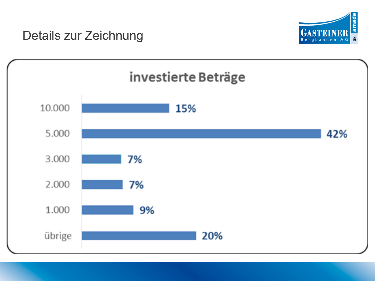 Es sollten alle Alterskohorten angesprochen werden. Investitionen waren von Kleinbeträgen im Wert von 100 Euro bis hin zum gesetzlich vorgeschriebenen Höchstbetrag von 5.000 Euro möglich. Überraschend für die Gasteiner Bergbahnen war, dass der Maximalbetrag die beliebteste Investitionssumme (42 %) darstellte.