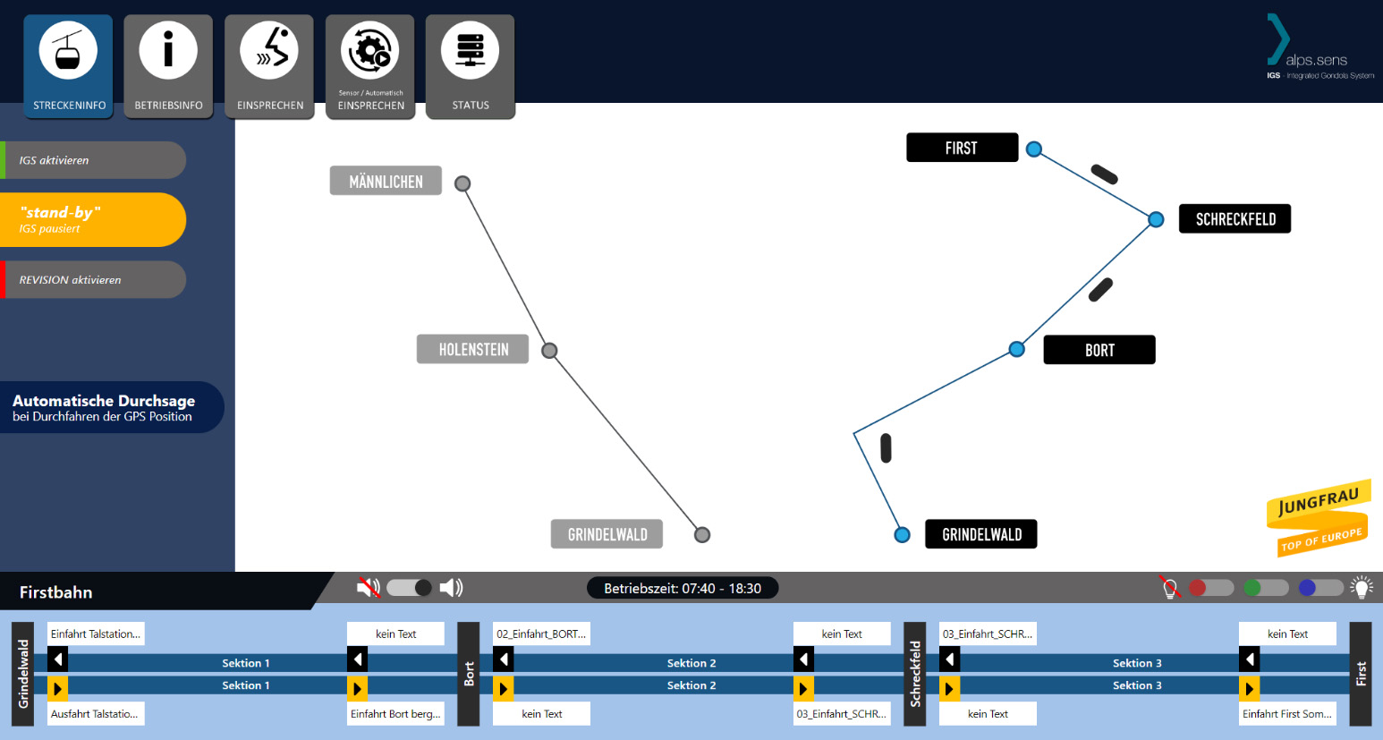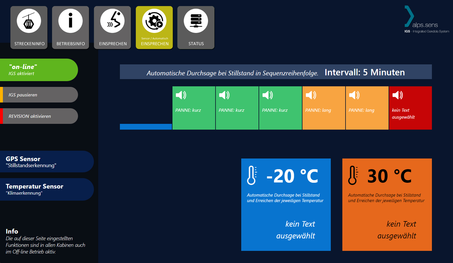 IGS steht bekanntlich für Integrated Gondola System. Das Produkt von ALPS. SENS informiert Fahrgäste während der Seilbahnfahrt automatisch per  Durchsage über Aufenthalte, Wartezeiten und Störungen.