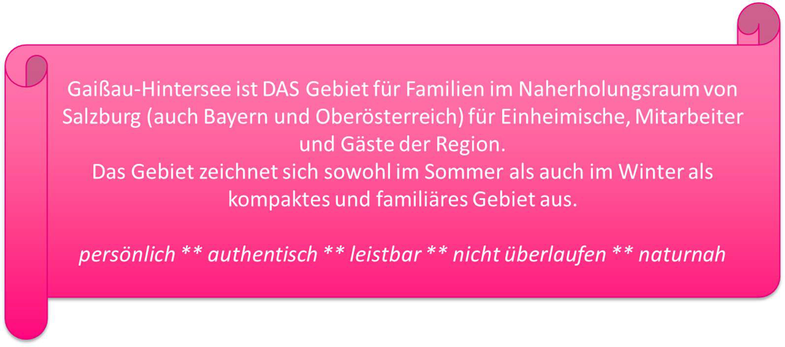 Der Gesamtprozess startete, neben den tourismusspezifischen Analysen zur Region, mit umfassenden Einzelgesprächen mit den touristischen und regionalen Entscheidungsträgern. Diese Vorarbeiten dienten unter anderem auch der gemeinsamen Zukunftswerkstatt, an welcher über 200 Bürgern der Region teilnahmen, um ihre Vision über die Zukunft von Gaißau/Hintersee zu erarbeiteten.