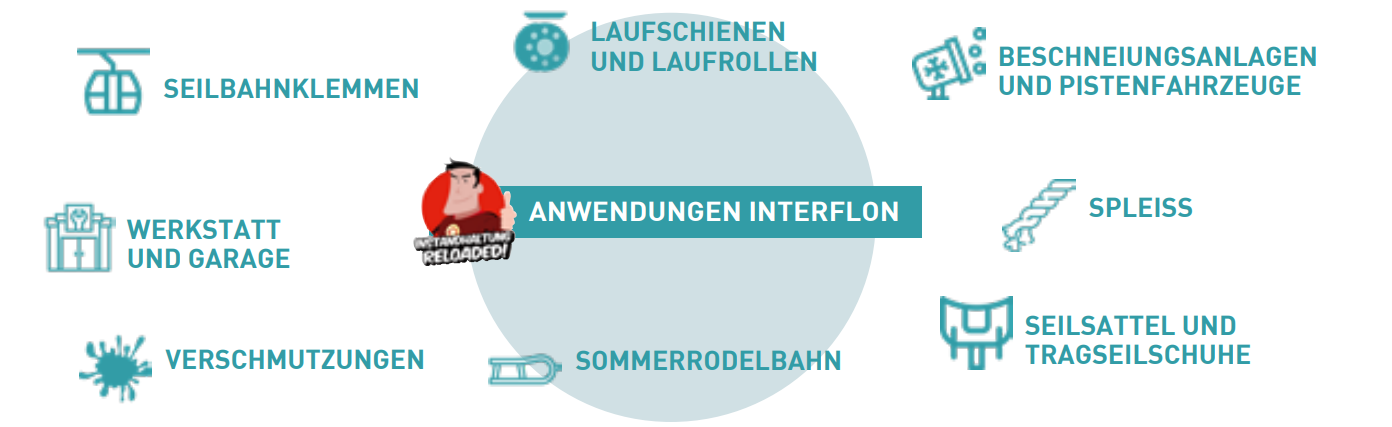 Dasselbe gilt für Schneeerzeuger, Pistengeräte, Schlagschrauber, Infrastruktur, Schlösser, sowie Stromschalter, -verbindungen und -stecker. Zusammen mit den Reinigern und weiteren Fetten und Ölen decken die drei Produkte nahezu jeden Bereich in einem Skigebiet ab (siehe Grafik).