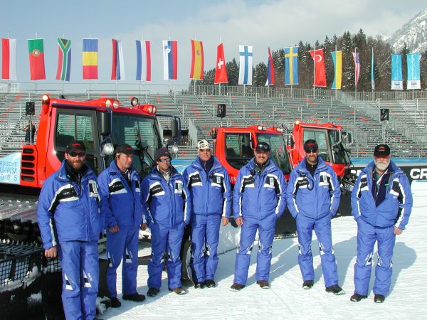 fährt Erich Dressel (dritter v. rechts) in Oberstdorf PistenBully. Seine Erfahrung von zwei Weltmeisterschaften und sein Input waren bei der Entwicklung des PistenBully 100 sehr gefragt, denn er weiß ganz genau, worauf es ankommt. Seit 1987 ebenfalls dabei: Fidel Joas (Mitte).