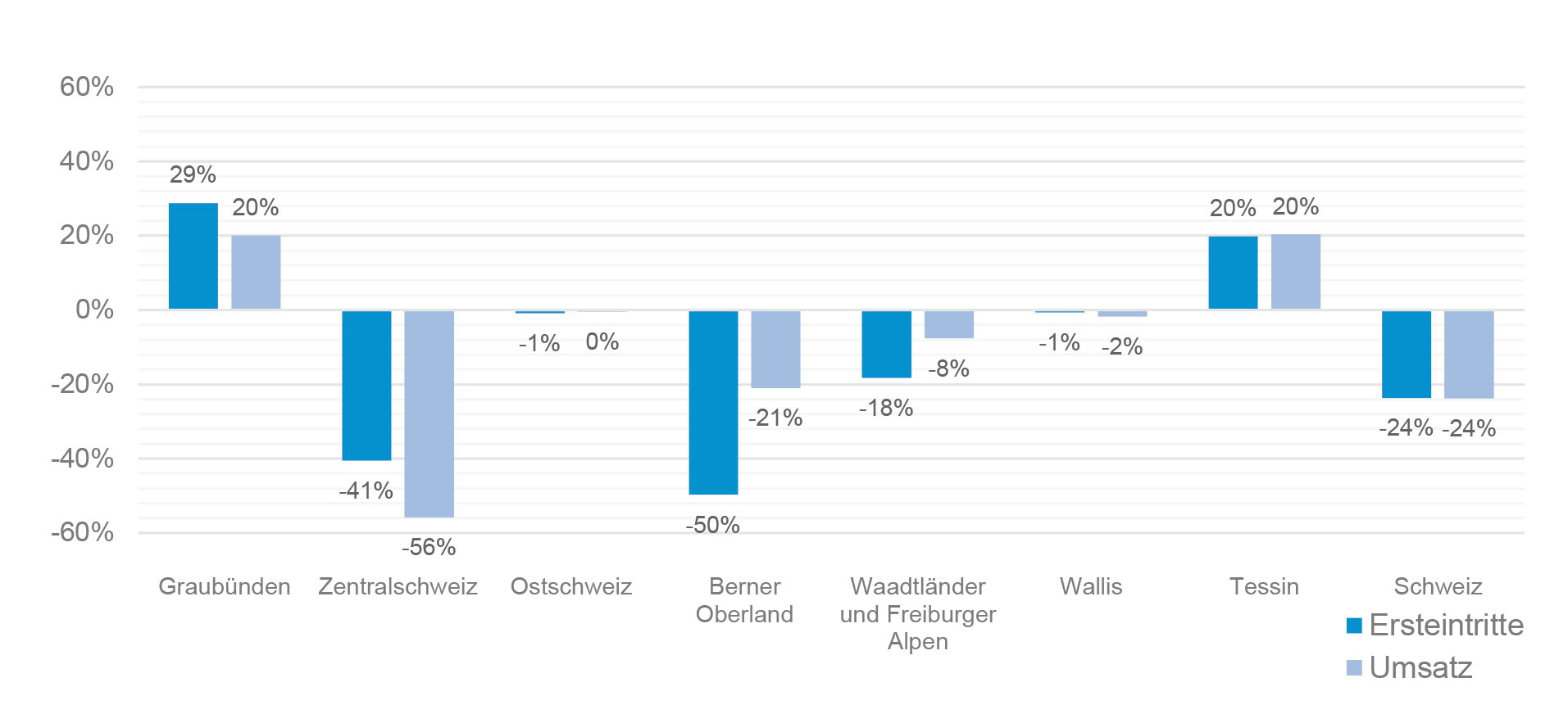 Tessin und Graubünden haben dank gutem Wetter und viel Sonnenschein sowohl die Frequenzen als auch die Umsätze steigern können. Beim Wallis und der Ostschweiz konnte man den schwierigen Saisonstart immerhin kompensieren.