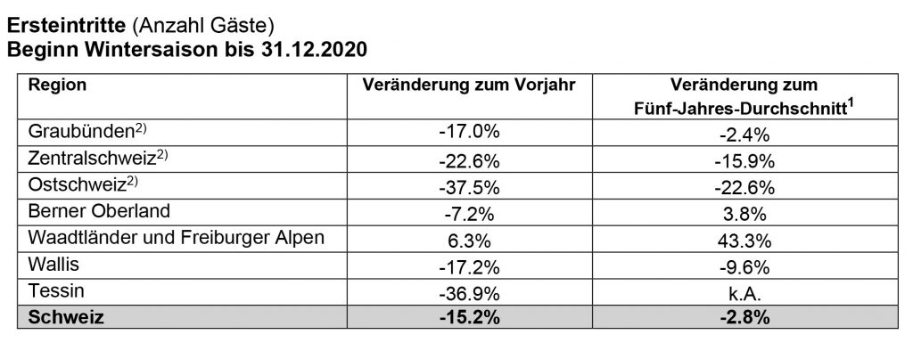 Einzig die Waadtländer und Freiburger Alpen konnten von den viel besseren Schneeverhältnissen gegenüber dem Vorjahr profitieren. Ebenso von der Tatsache, dass die Bergrestaurants in der Romandie größtenteils offengeblieben sind. Jedoch vermochte die dank des milden und schönen Wetters registrierte Steigerung der Gästeanzahl im November um einen Drittel den Gästerückgang im Dezember bei weitem nicht zu kompensieren.