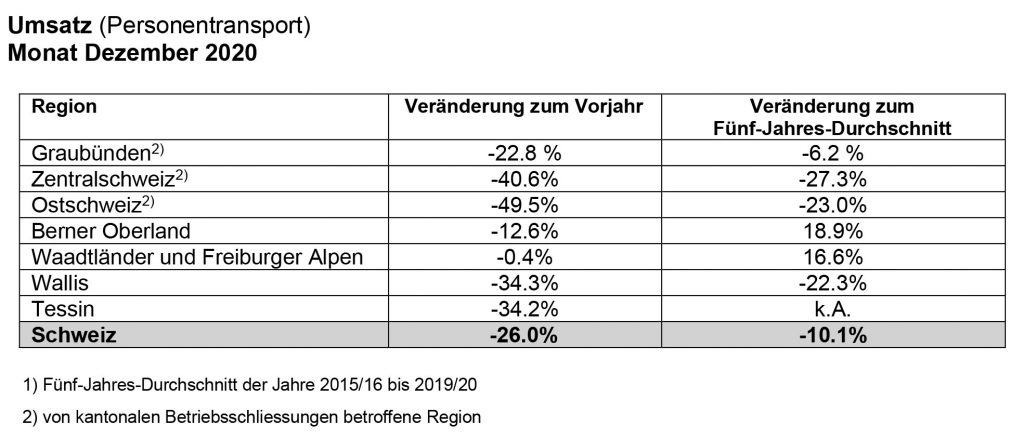 Die größten international ausgerichteten Skigebiete besonders in den Kantonen Wallis, Graubünden und Bern erlitten sehr hohe Umsatzeinbußen zwischen 40-60 Prozent. Aber auch Gebiete mit traditionell vielen Tagestouristen verzeichneten spürbare Verluste. Dazu trugen die zunehmende Stigmatisierung des Skisportes und die nicht optimalen Wetterverhältnisse maßgebend bei.