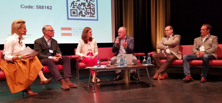 Moderatorin Alexandra Meissnitzer im Branchen-Talk mit (von links): Wolfgang Mayrhofer (Skiindustrie), Lisa Weddig (Österreich Werbung), Erich Egger (Seilbahnwirtschaft), Manfred Katzenschlager (Tourismus) und Gerhard Sint (Skischulen).