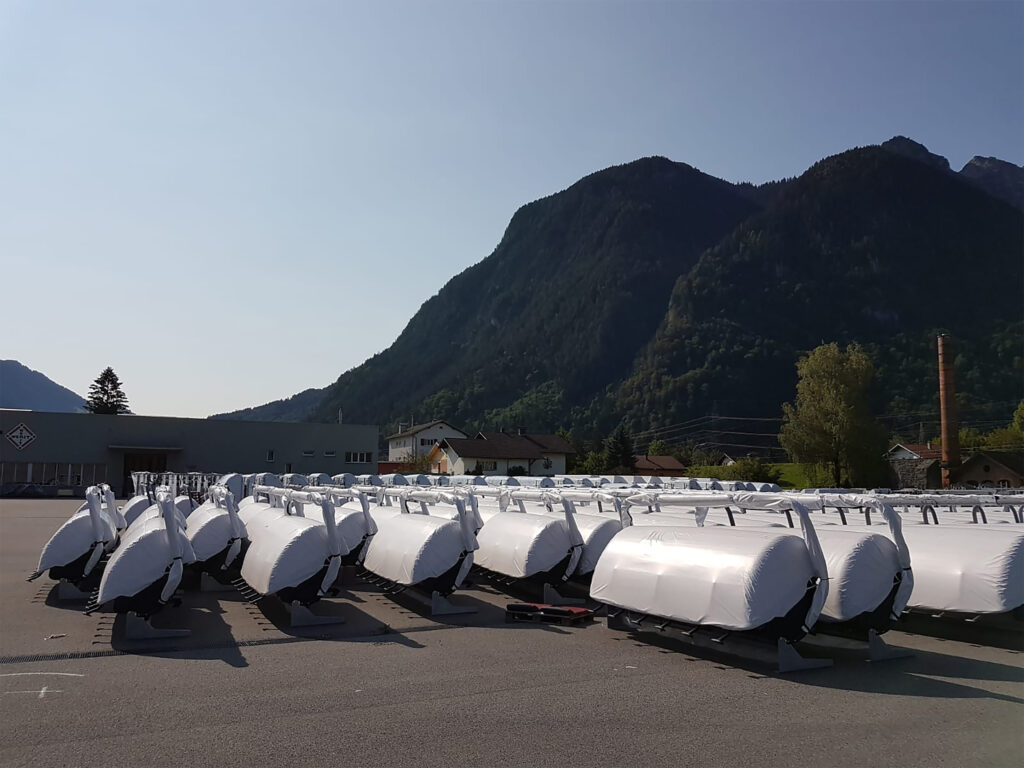 In der Vergangenheit wurden diese Wetterschutzhauben, auch Bubbles genannt, mit Handstretchfolie eingewickelt. Diese Lösung brachte mehrere Nachteile mit sich: Die Folie war nicht UV-stabil und musste daher regelmäßig erneuert werden.