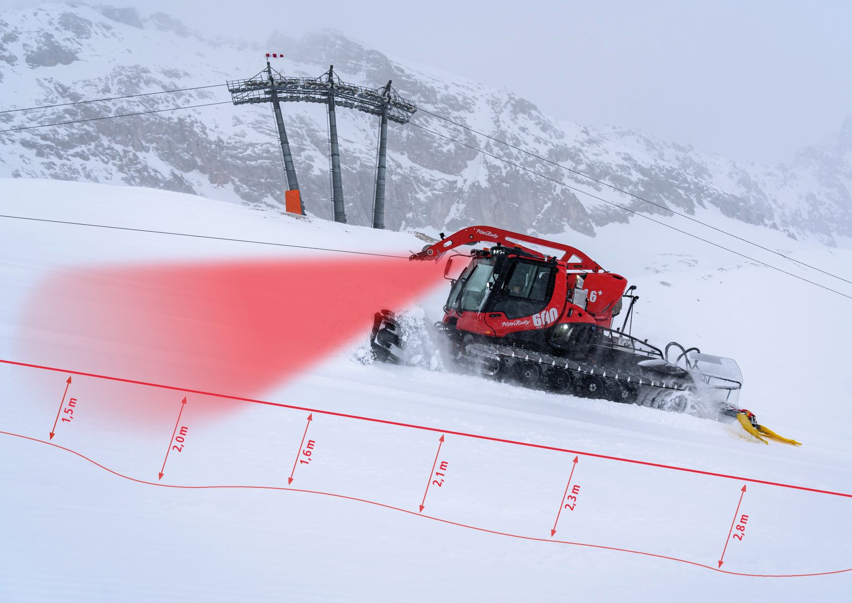 Die vorausschauende Schneetiefenmessung kommt hierbei voll zum Einsatz. Martin Hurm, Betriebsleiter der Bayerischen Zugspitzbahn Bergbahn AG, zeigt sich begeistert: „Meine Erwartungen an die vorausschauende Schneetiefenmessung wurden jetzt schon übertroffen. Dass wir die Schneetiefendaten weit vor dem Fahrzeug und seitlich des Fahrzeugs kennen, hilft uns vor allem beim Erstellen von Schneedepots und beim Einschieben von Pisten. Das ist ein Quantensprung!“