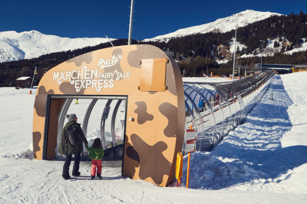 Zauberteppiche heute: Hochmodernes Doppelförderband mit Thematisierung und als vielseitige Transportlösung. Fotos: Bergbahnen Fiss-Ladis/ SUNKID (r.)