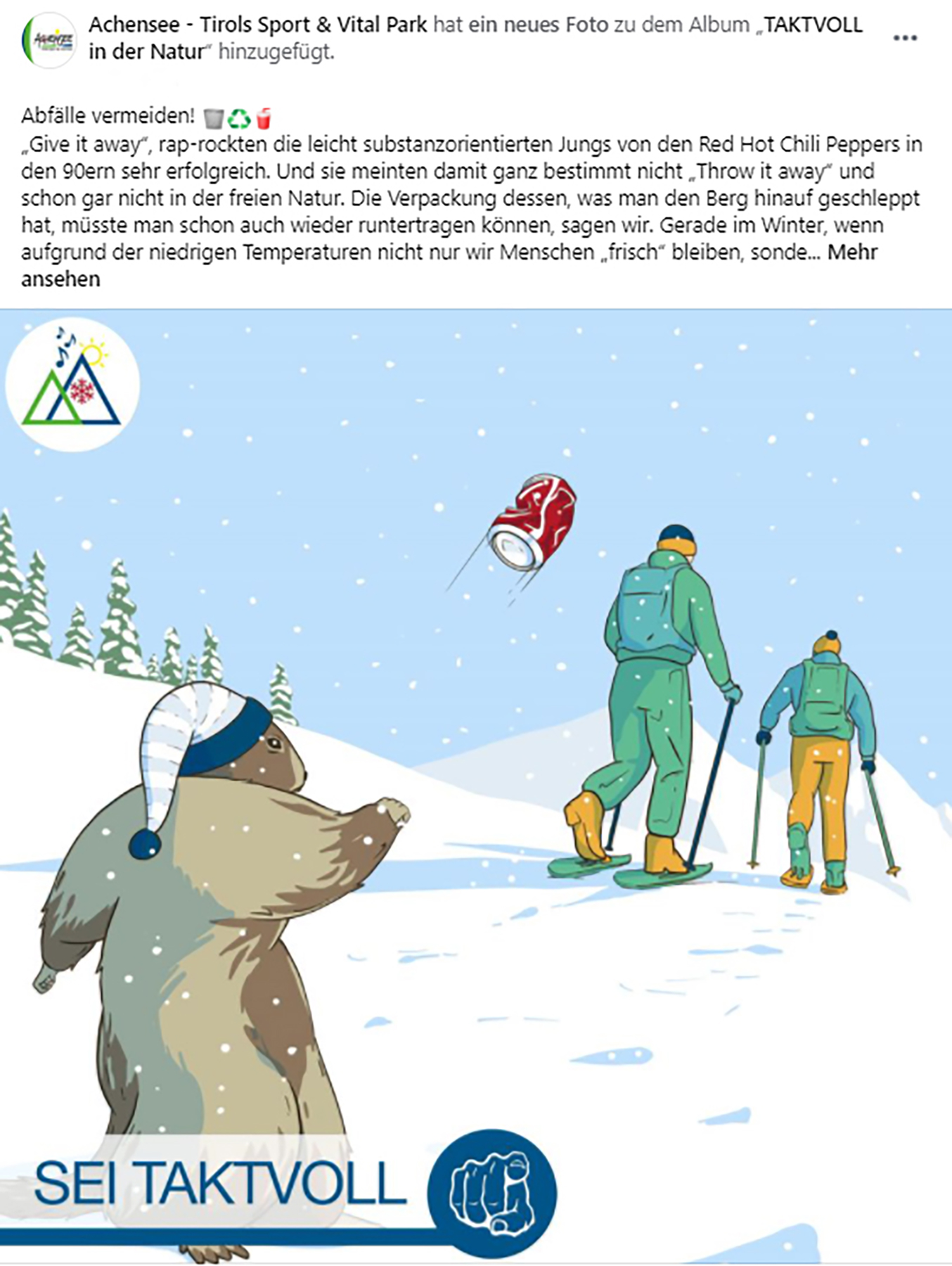 Die zugehörige Facebook-Awareness-Kampagne „Taktvoll“ ist in ihrer Winterversion bereits in zweiter Auflage online: Mit humorvollen Comics, popkulturellen Referenzen und informierenden Captions sollen die Beiträge bei Gästen und Bevölkerung ein erweitertes Bewusstsein für einen respektvollen Umgang mit der Natur und miteinander schaffen.