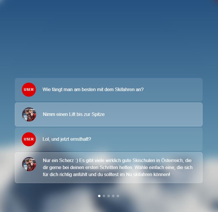 Auf der Website chatskipt.com schreiben die Besucherinnen und Besucher ihre Fragen in ein Chatfenster, analog zu ChatGPT. Anstelle von KI antworten 16 Skilehrerinnen und Skilehrer aus den österreichischen Skiregionen.