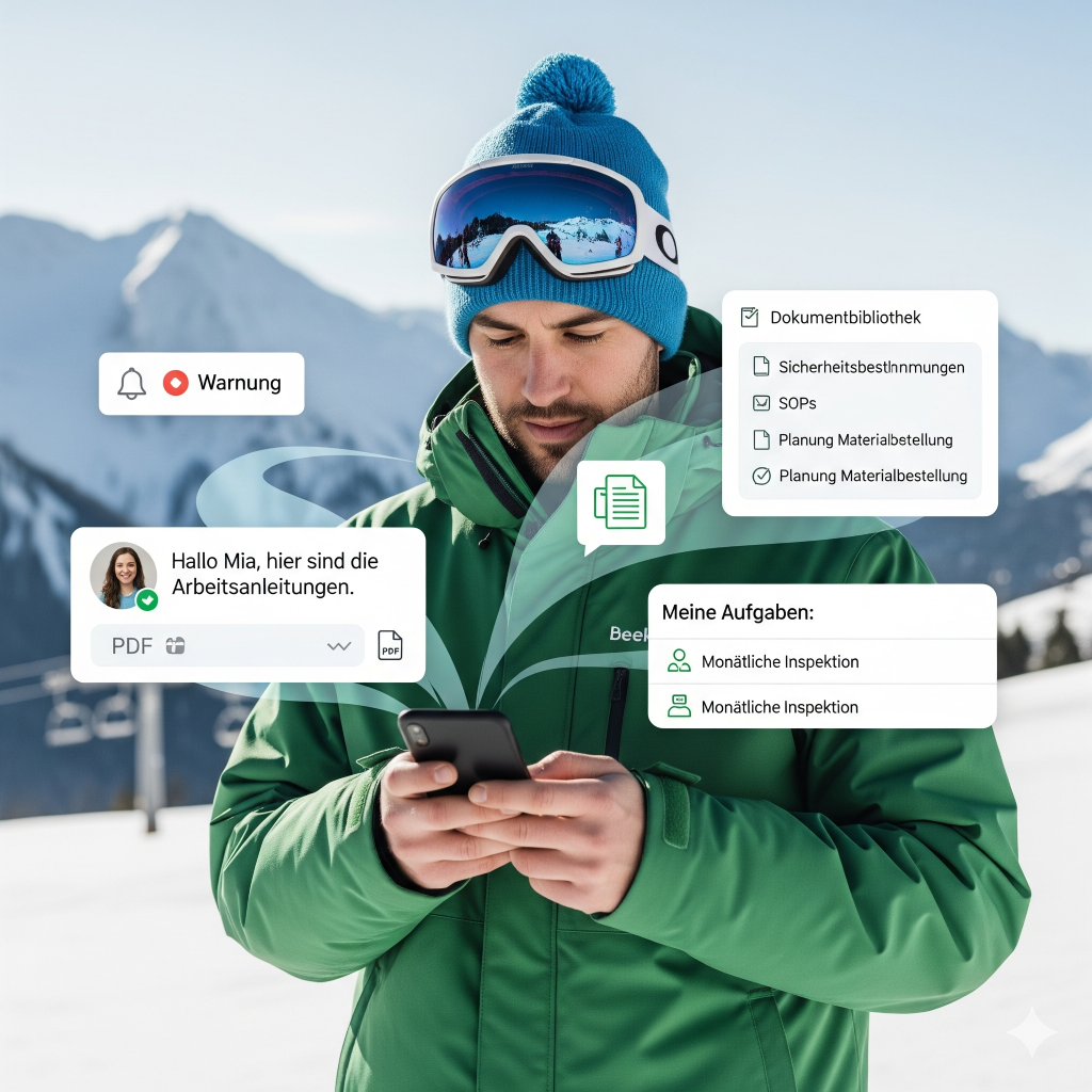 - Mitarbeitende im Zentrum: In der Seilbahnbranche arbeitet der Großteil der Belegschaft nicht am Schreibtisch. Pistenretter, Mechaniker und Servicekräfte sind mobil. Erreicht man diese Menschen nicht digital, bleibt eine „digitale Kluft“ bestehen, die Effizienz und Sicherheit gefährdet.