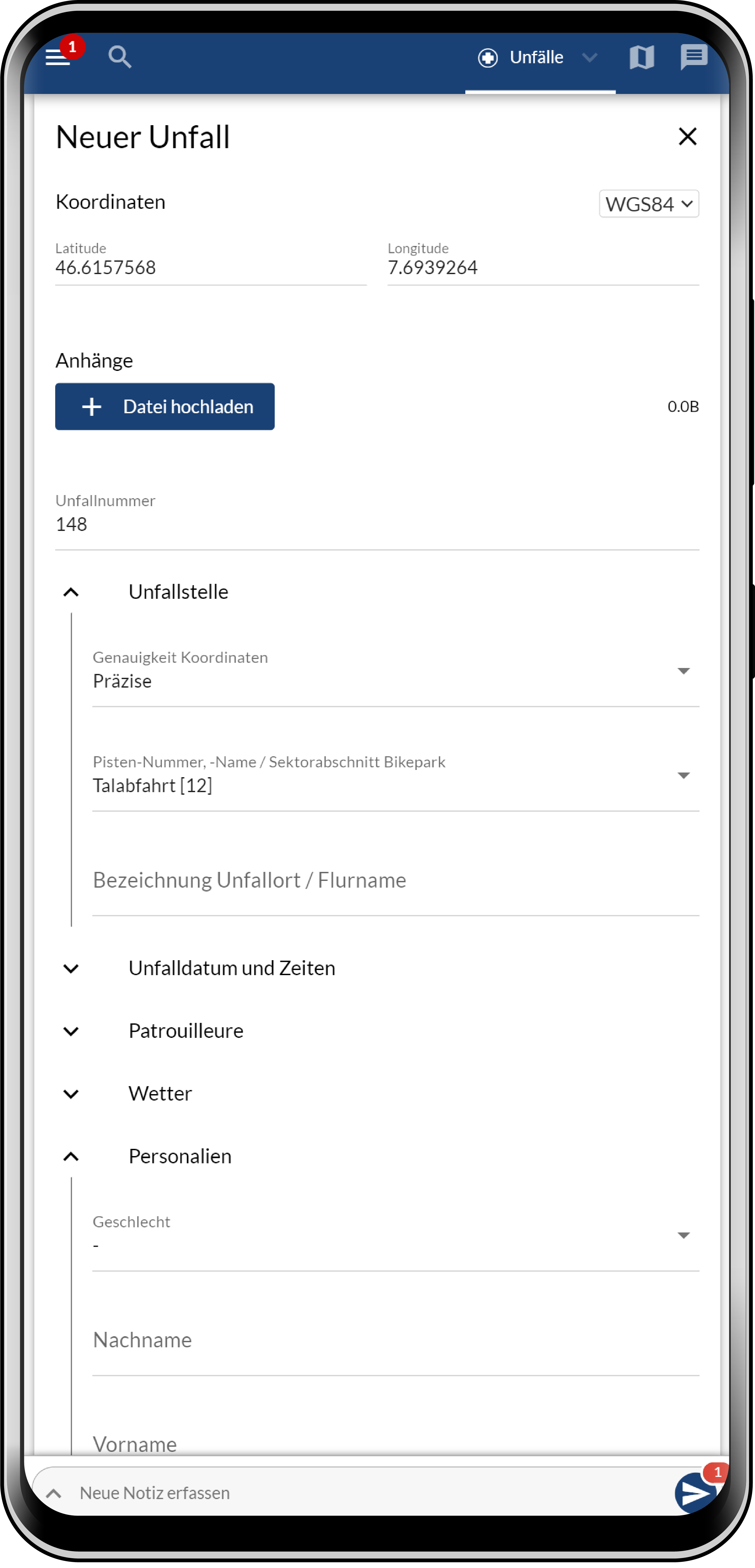 In RescueDoc werden die Unfalldaten und der Pistenretter erfasst und auf einer Karte dargestellt.