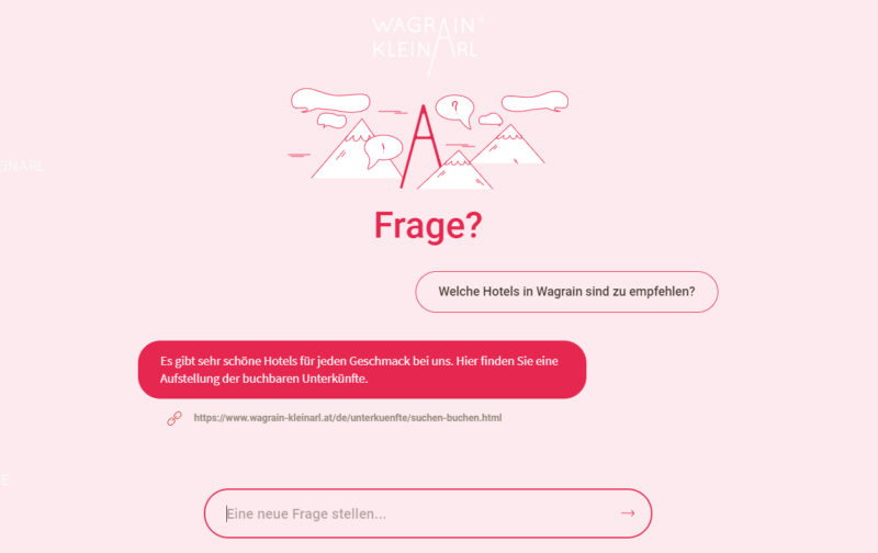 Jedoch konnten die ersten Tests der KI, von den Entwicklern von „goodguys.ai“, überzeugen. Die Antworten scheinen menschliche Züge zu haben und ein Gefühl der Empathie sowie des Mitdenkens zu vermitteln. Die Antwortfähigkeit des AI-Concièrge, wie sich der Chatbot selbst vorstellt, beschränkt sich dabei hauptsächlich auf die Fragen rund um den Urlaub in Wagrain-Kleinarl und beherrscht fast alle Sprachen.