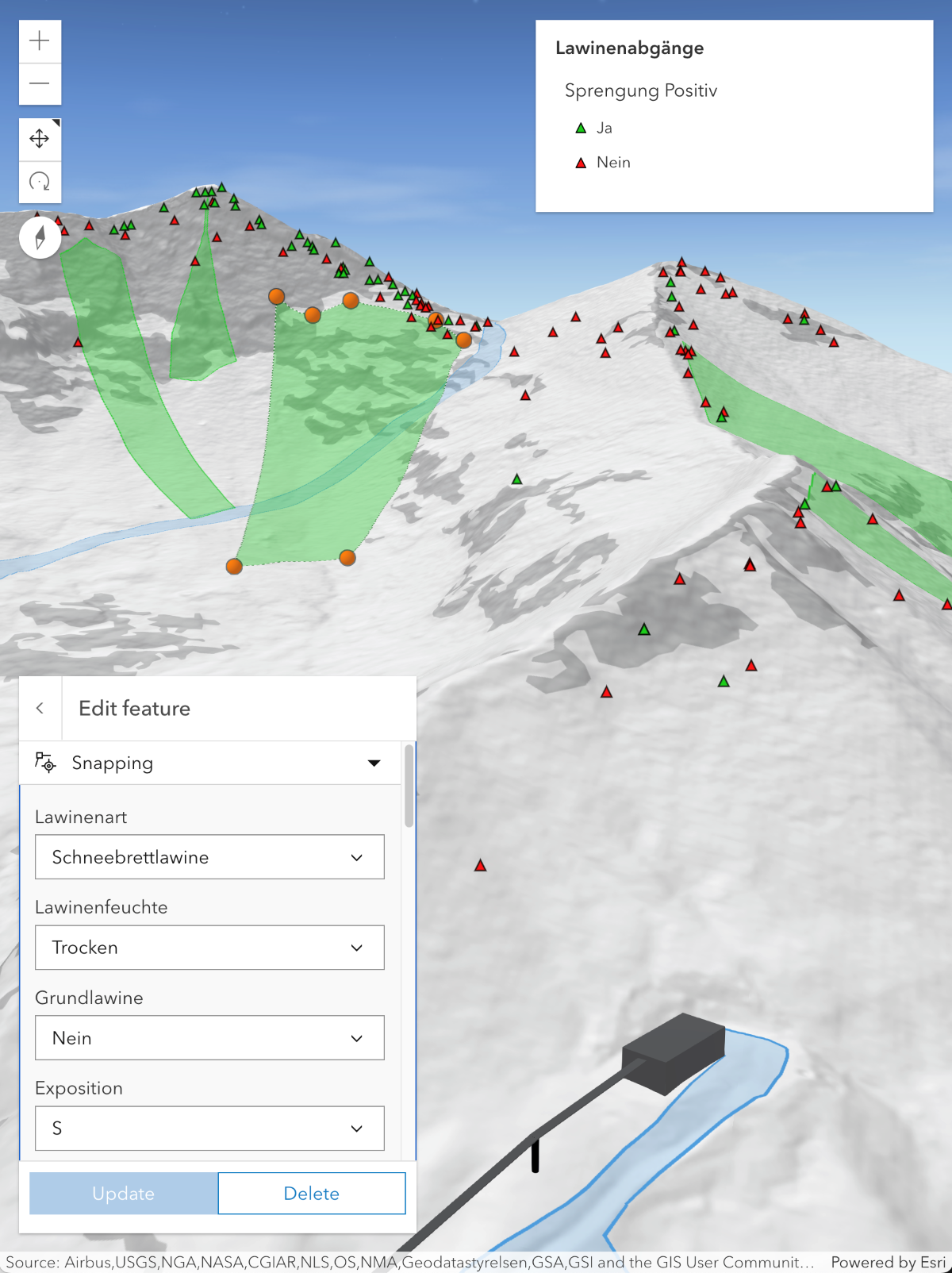 Sprengrouten, Lawinensprengungen, Lawinenzüge und Sprengmasten können in der Applikation aufgezeichnet werden. Damit wird der Lawinenschutz einfacher und übersichtlicher.