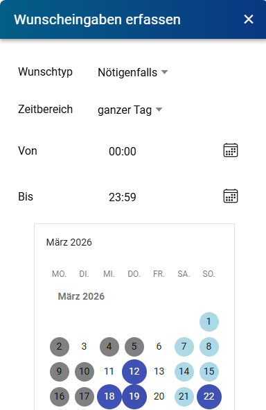 Über die Infosoft Mobile App greifen Mitarbeitende auf Dienstpläne und Informationen zu und können mittels der Zusatz-Funktion Wunscheinteilung ihre Präferenzen einbringen (siehe Abbildung).