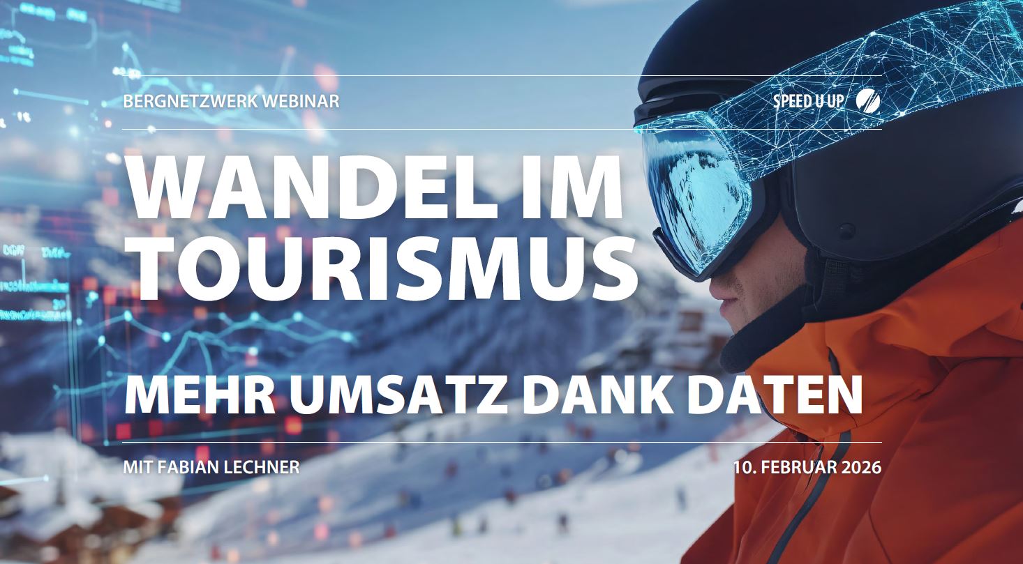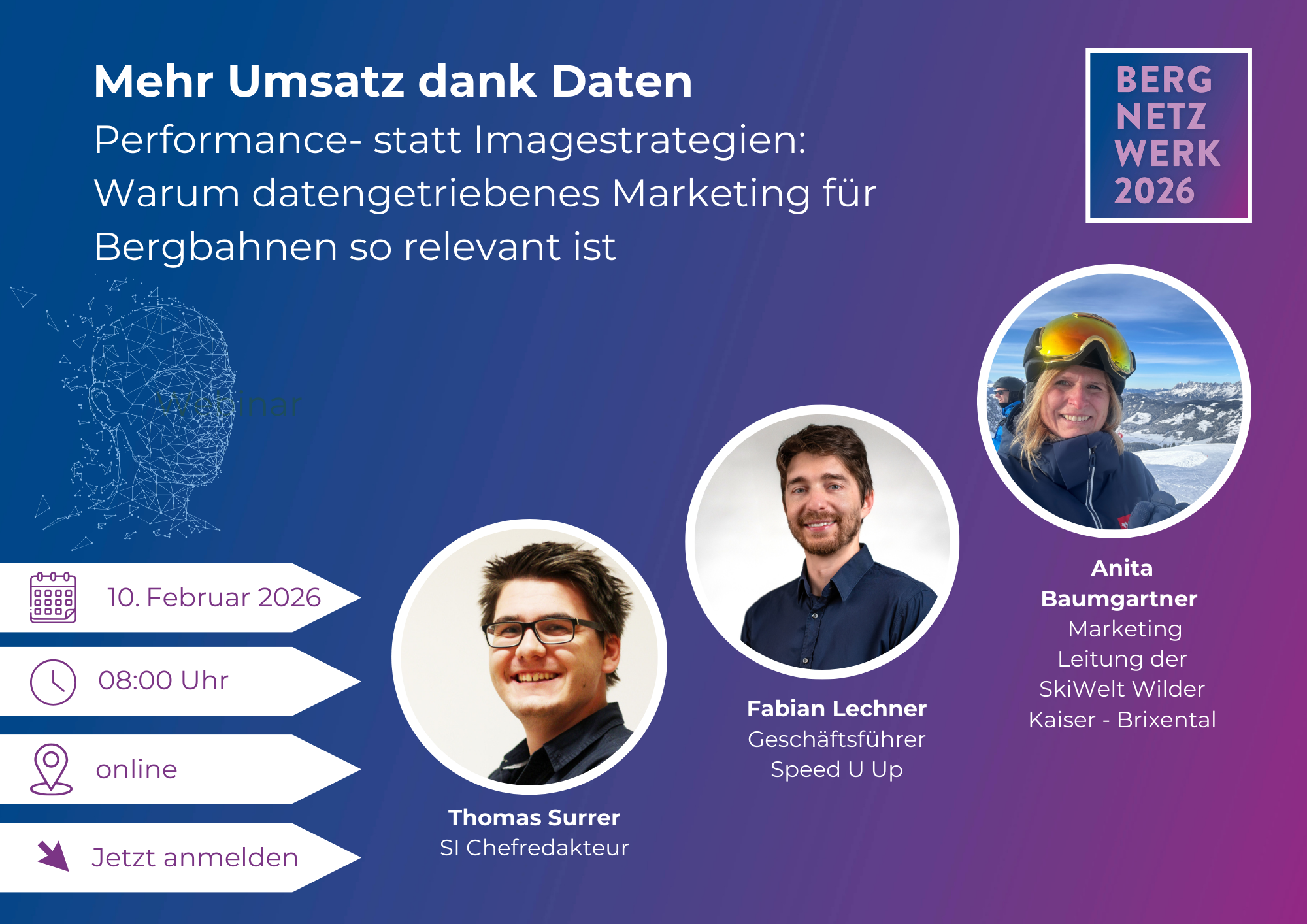 70 Anmeldungen und 60 Teilnehmende: Im Webinar „Mehr Umsatz dank Daten: Performance statt Imagestrategien “ erklärten Anita Baumgartner, Marketing Leitung der SkiWelt Wilder Kaiser - Brixental, und Fabian Lechner, Geschäftsführer der Digitalagentur Speed U Up, warum datengetriebenes Marketing für Bergbahnen so relevant ist. Hier geht es zum Video und zur Präsentation.