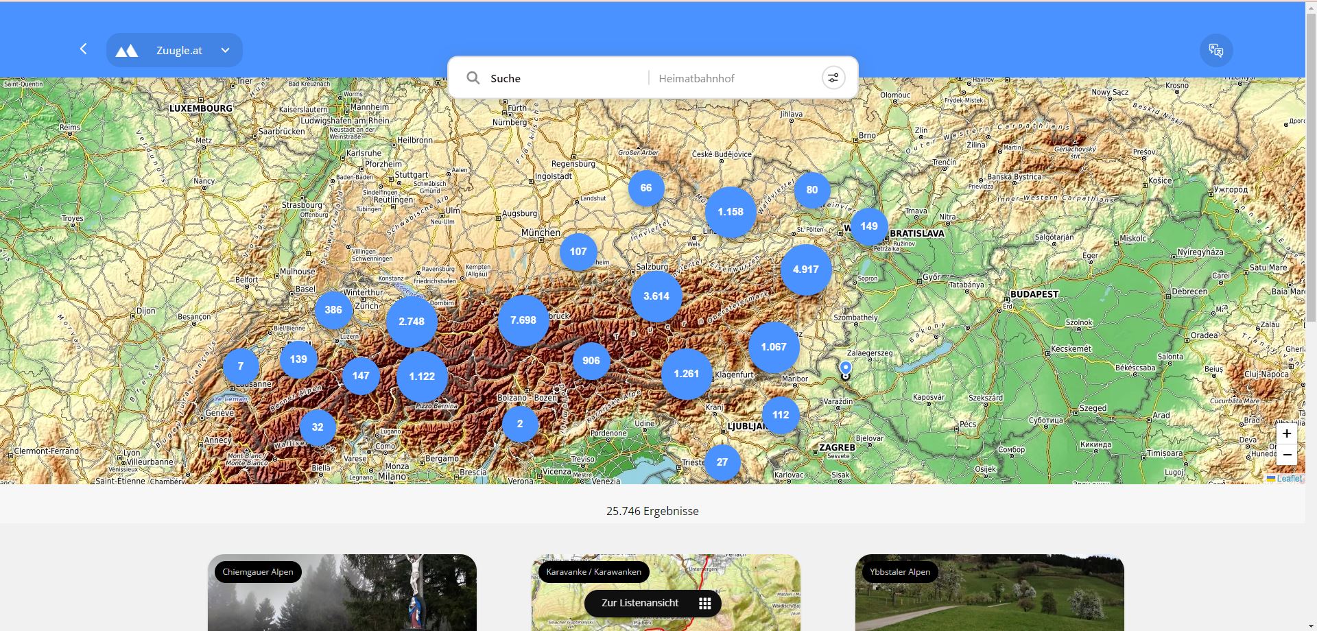 Dabei beschränkt sich Zuugle nicht mehr nur auf Österreich und Bayern, sondern umfasst seit neuestem auch den Alpenraum in Slowenien, in Italien und der Schweiz. In all diesen Ländern ist es ab jetzt möglich, innerhalb einer Region oder ab einem Heimatbahnhof Touren herauszusuchen, die öffentlich erreichbar sind. Frankreich wird folgen.