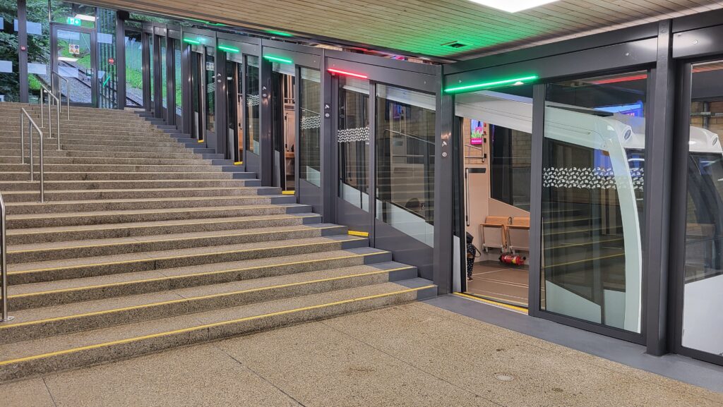 „In den Randzeiten ist von uns keiner mehr vor Ort, die Standseilbahn fährt selbstständig“, so Matter. Nach Betriebsschluss löscht die Steuerung automatisch das Licht und schließt die Tore.