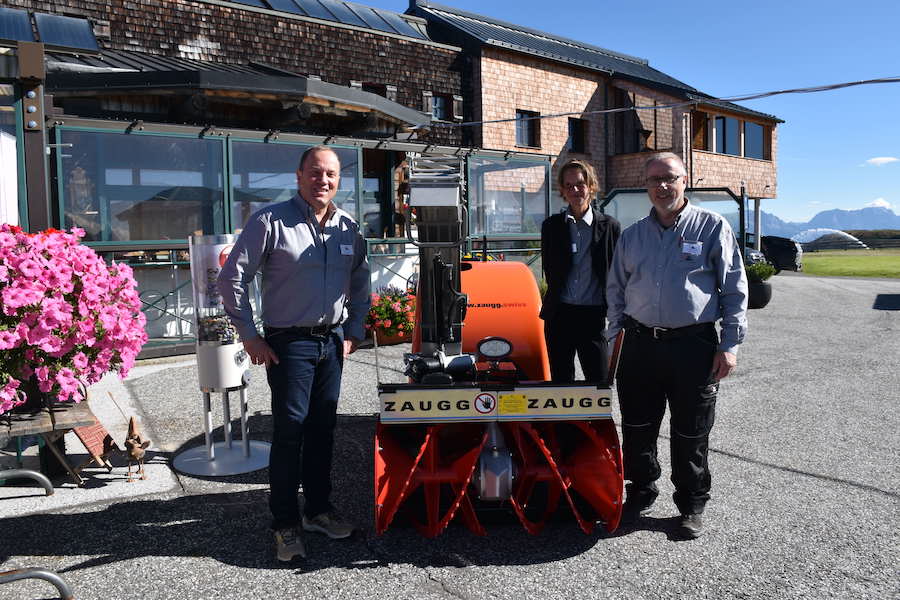Im Außenbereich – auf der Terrasse der Wildenkarhütte – stellte die Firma ZAUGG ihre handgeführte Schneefrässchleuder Bulldogg vor. Friedrich Kirmaier warb für den Bulldogg als innovativen Ansatz für Schneeräumungen.