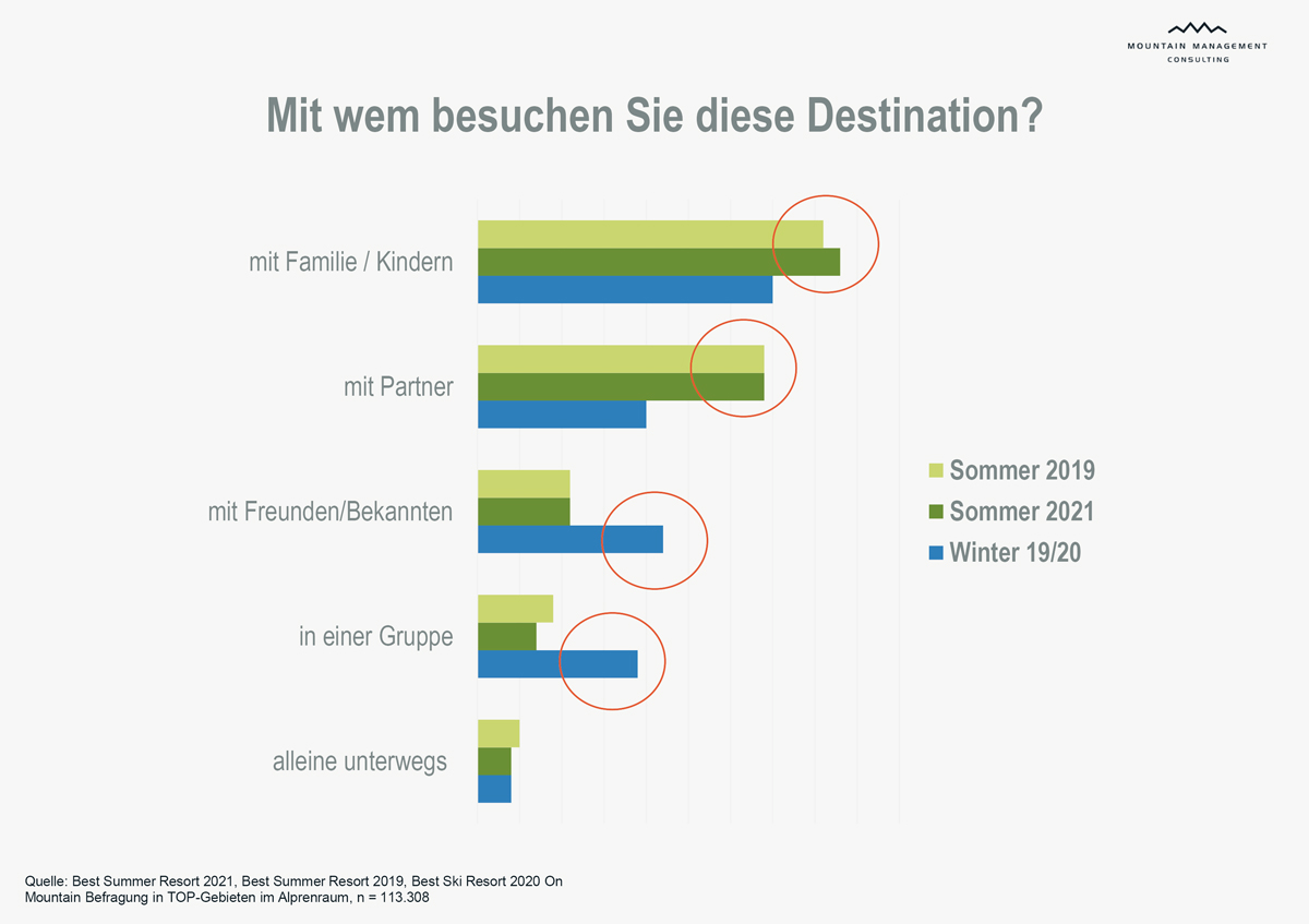 - Familien mit Kindern bilden mit über 40 % den höchsten Anteil an Sommergästen. Im Vergleich liegt der Anteil dieser Gruppe im Winter bei „nur“ 35 %.