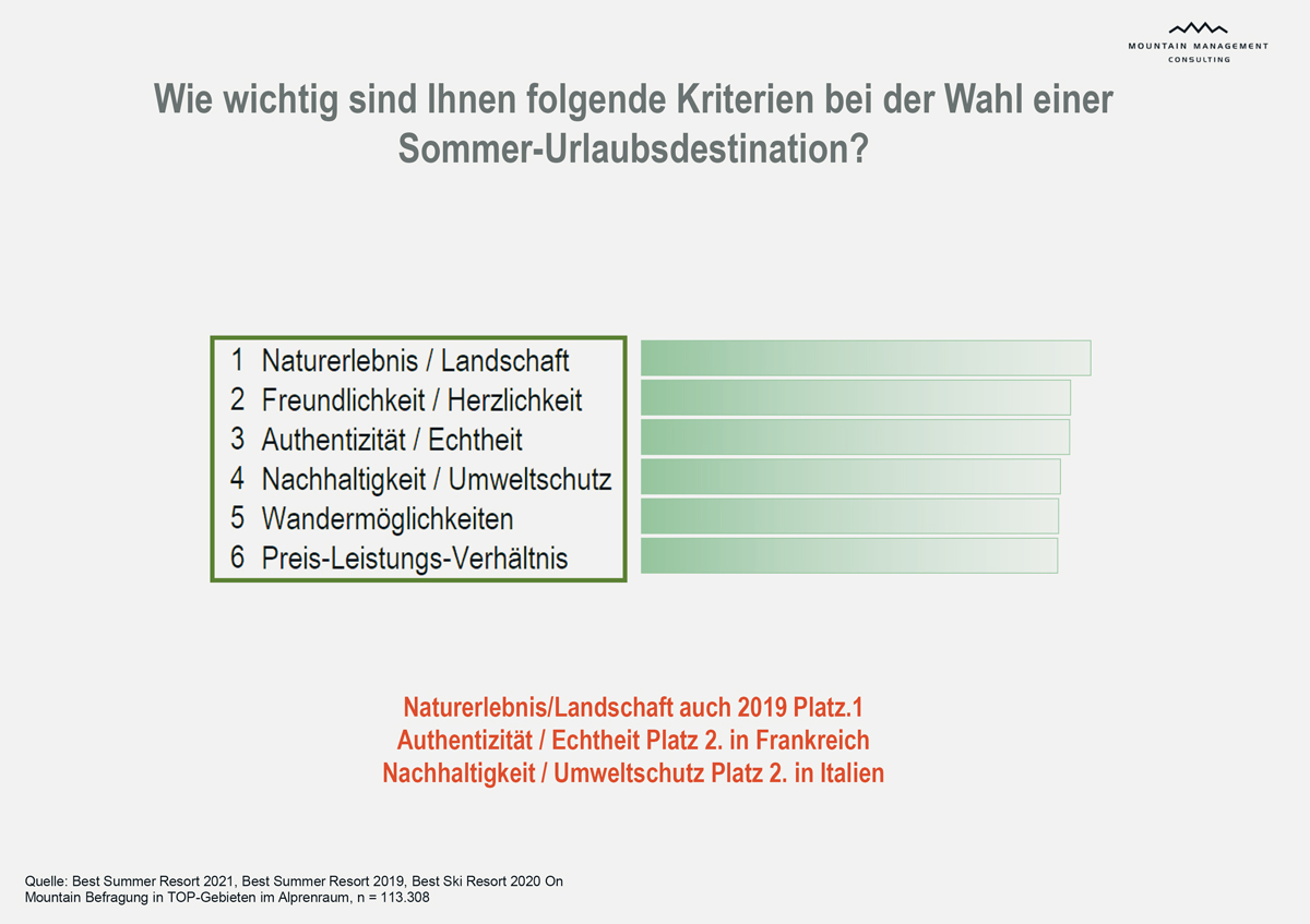 - Das wichtigste Entscheidungskriterium für die Wahl einer Sommerurlaubdestination in den Bergen ist, wie auch 2019, das Naturerlebnis! Auf Platz zwei der wichtigsten Entscheidungskriterien folgt bereits das Thema Freundlichkeit/Herzlichkeit, was eine deutliche Steigerung im Vergleich zu 2019 darstellt.