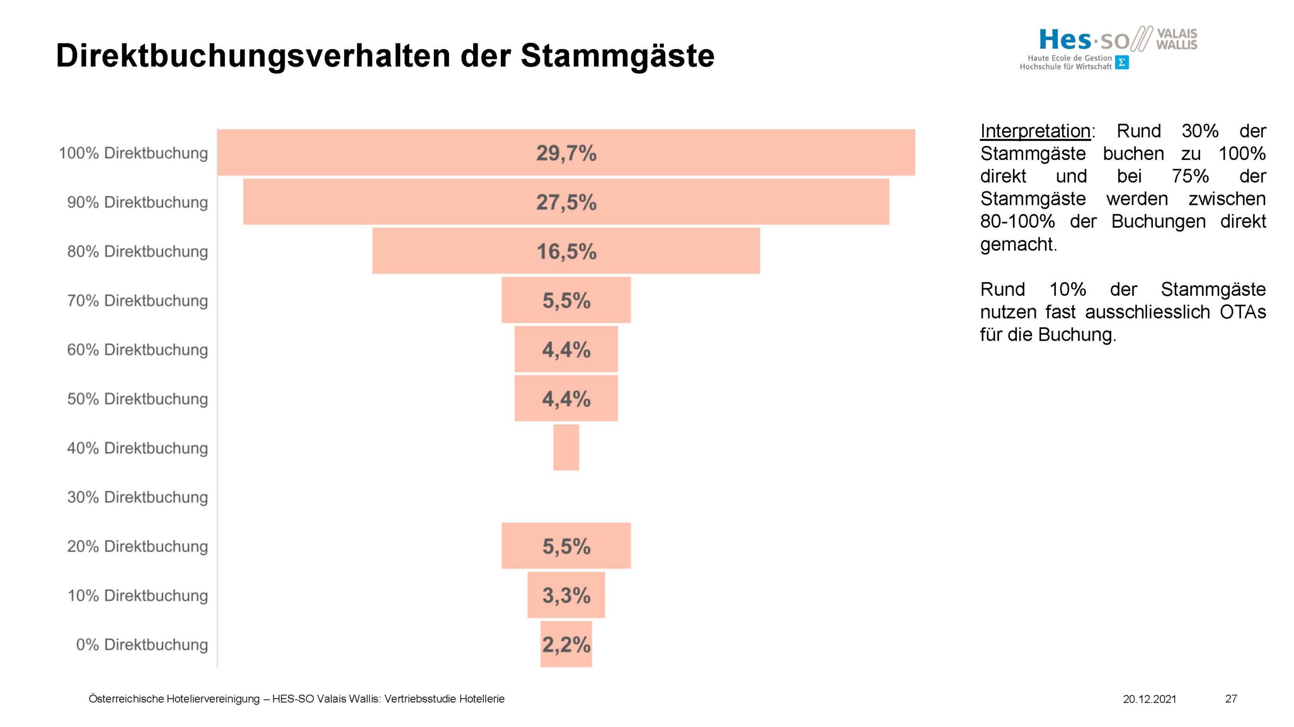 Zu den treuesten Direktbuchern zählen Stammgäste, zeigt Gratzer auf: 30 % der Stammgäste buchen immer direkt, drei von vier Stammgästen bei 80 bis 100 % der Buchungen: