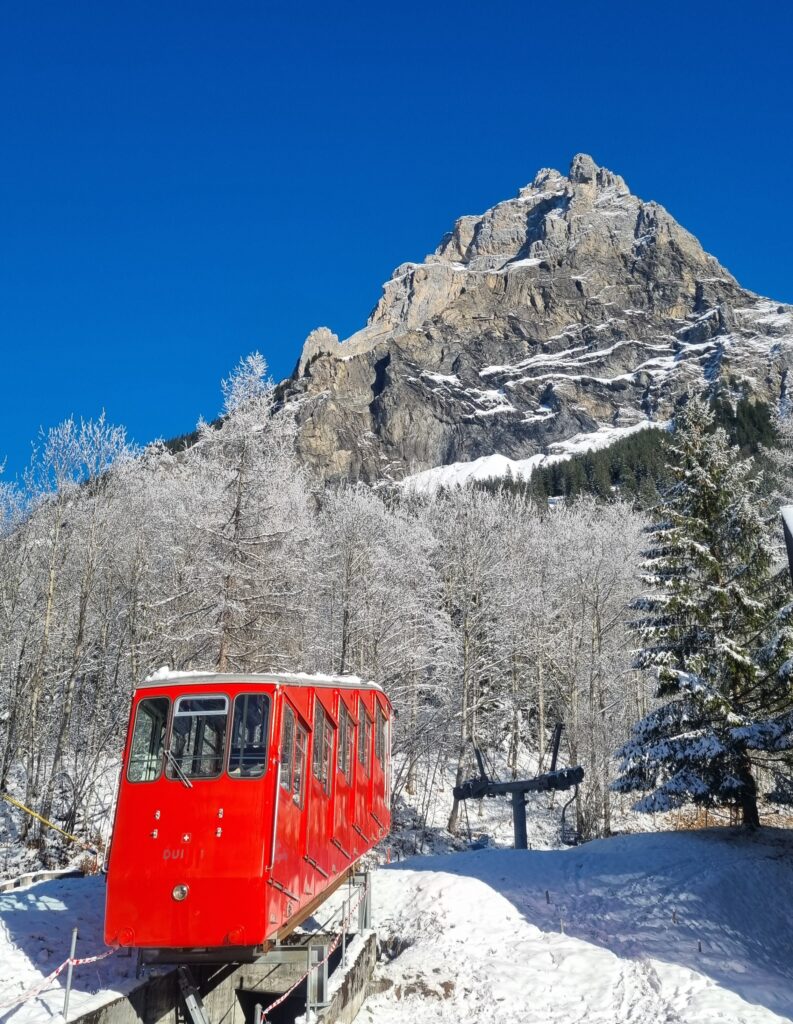 Die legendäre rote Standseilbahn am Iltios wird zum Wahrzeichen vergangener Seilbahntechnik und begeistert Besucher im verschneiten Alpenpanorama.