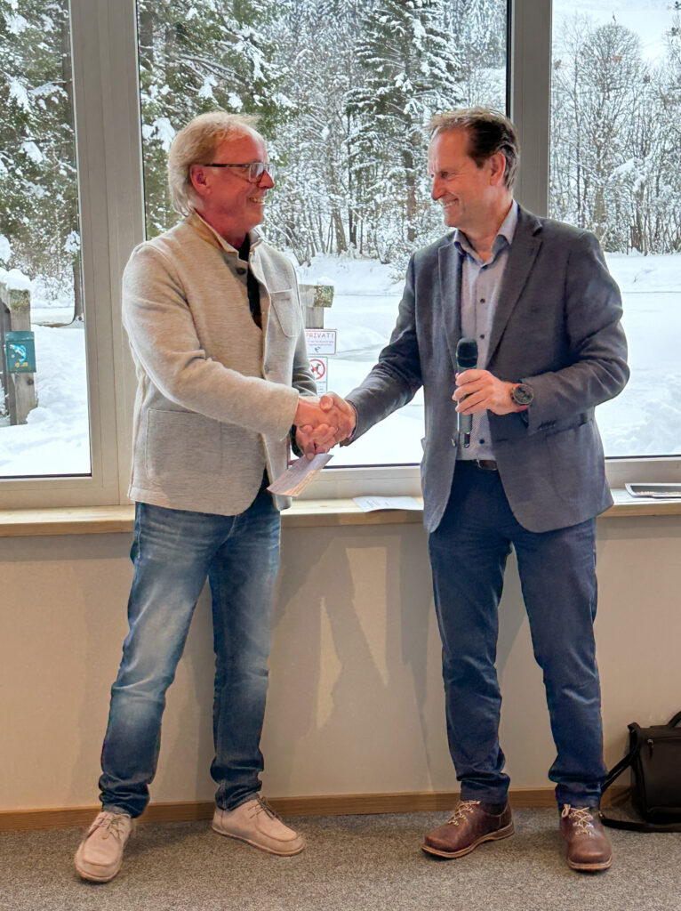 Erwin Petz, Geschäftsführer der Riesneralm Bergbahnen (rechts), bei der Schlüsselübergabe an Martin Kerschbaumer, Skischulleiter von „Snow Magic Riesneralm“ (links).