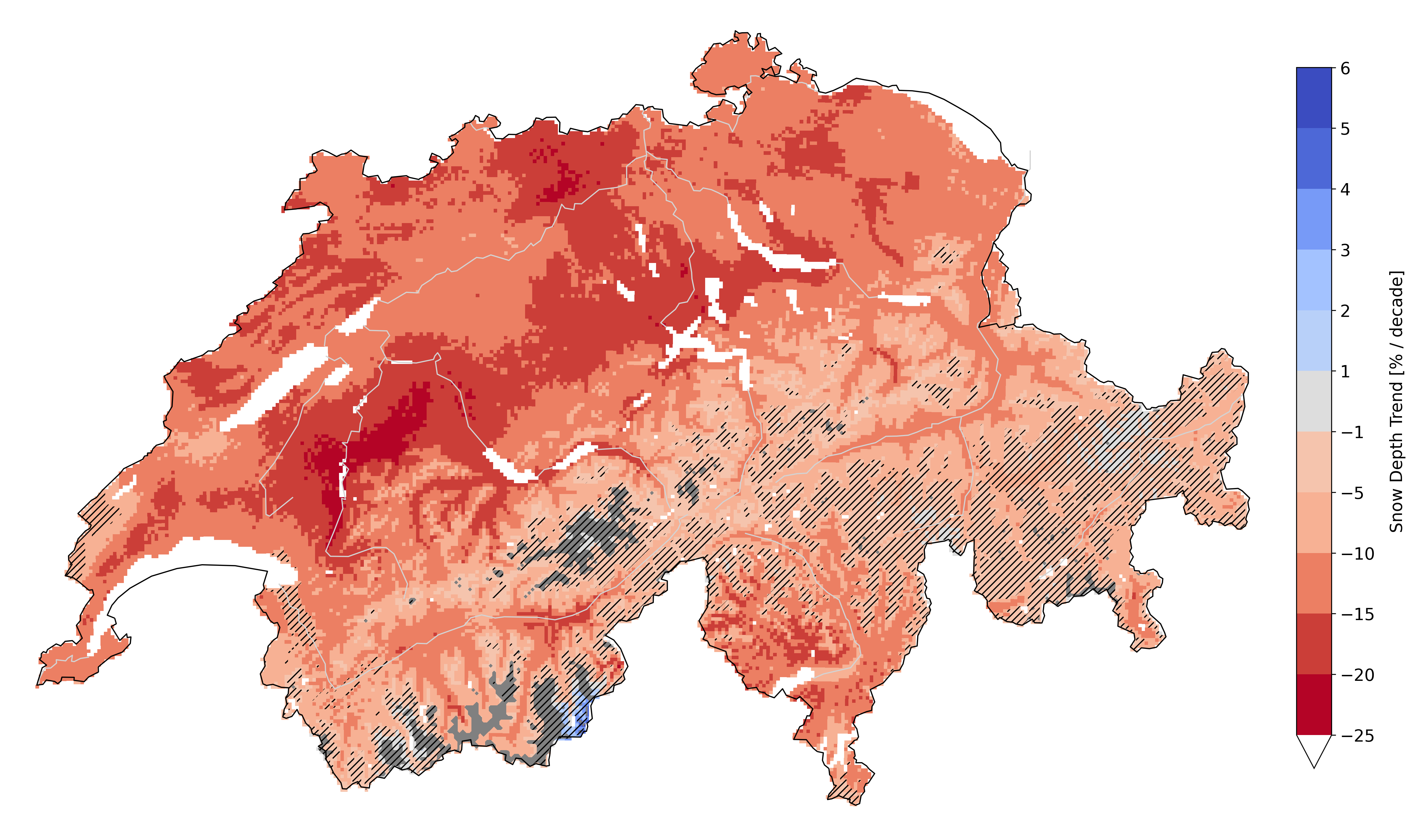 In den hohen Berglagen ist das Minus deutlich höher als im ohnehin schneearmen Mittelland. Gelände über 3000 m.ü.M. ist dunkelgrau markiert. In gestreiften Gebieten ist die Veränderung statistisch nicht signifikant.