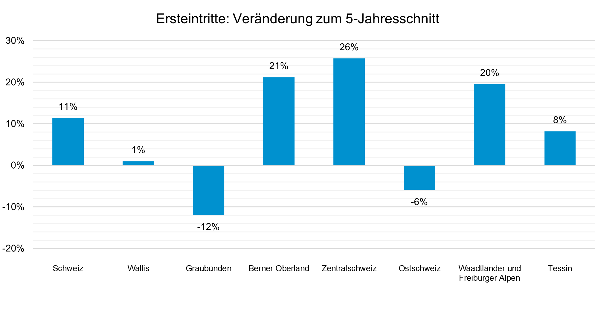 Insgesamt freuen sich die Schweizer Seilbahnen über 11 % mehr Gäste. Die Ostschweiz verzeichnet im Vergleich zum 5-Jahresdurchschnitt einen leichten Rückgang der Ersteintritte um 6%, Graubünden um 12% (vgl. Abb. 2).
